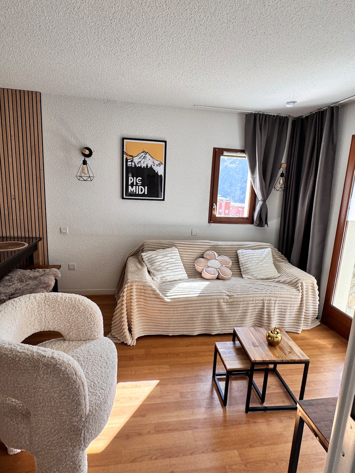 최근에 지은 레지던스 "픽 뒤 미디"의 아파트로 소파 베드가 있는 거실, 160cm 더블 침대가 있는 침실, 화장실, 욕실, 산 전망이 보이는 남향 테라스로 구성되어 있습니다. 주방 시설: 냉장고, 쿡탑, 식기 세척기, 전자레인지, 주전자, 네스프레소 커피 머신. TV, 진공 청소기, 스키 보관함 및 실내 주차장. 레지던스에는 온수 수영장, 무료로 이용할 수 있는 헬스장, 세탁기가 있습니다. 도보로 3분 거리에 있는 스키 슬로프.