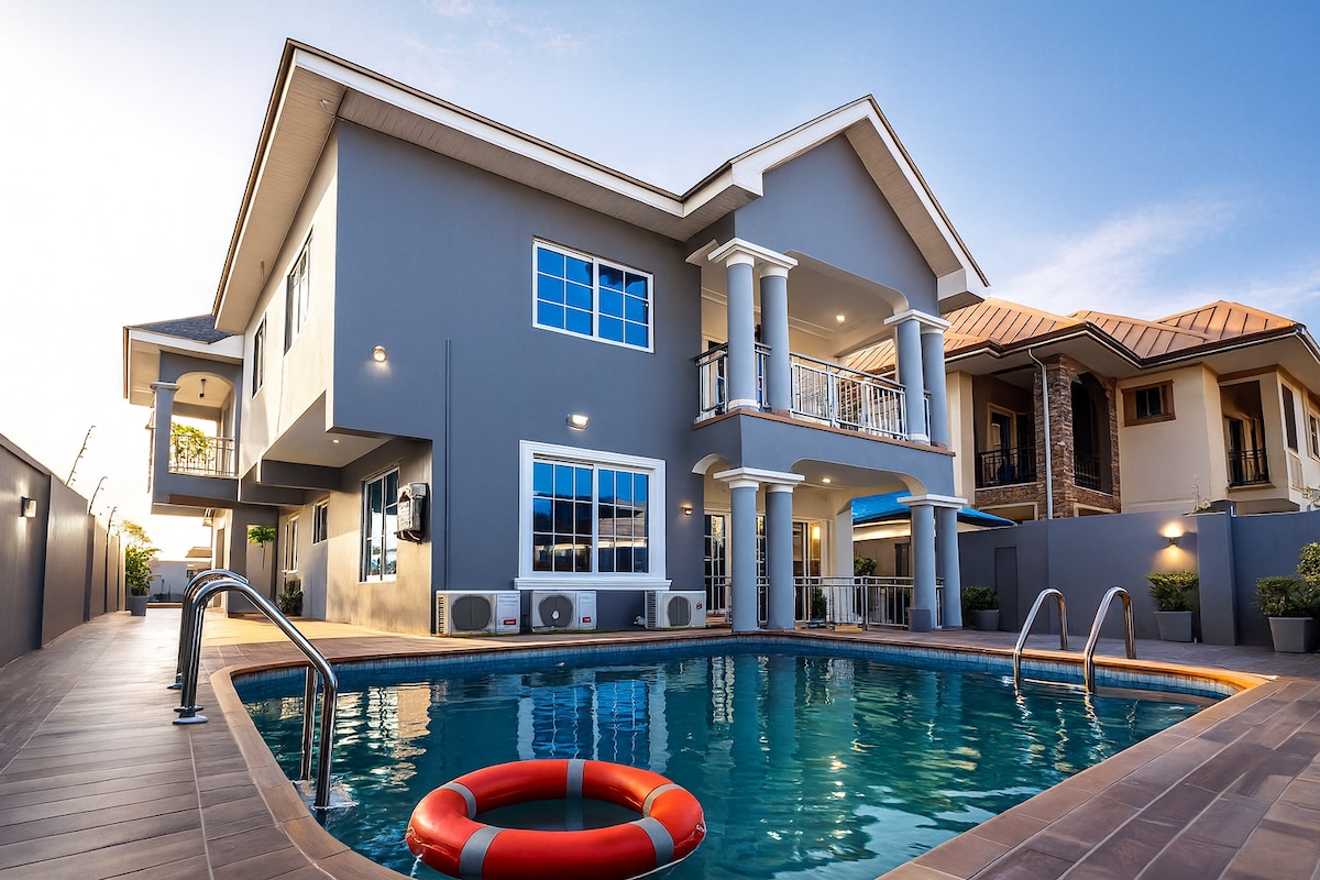 Welcome to Jab Villa! A luxurious 5-bedroom villa Located in Adenta West, Ghana. It combines modern comfort with serene elegance. It features spacious, tastefully decorated rooms and a fully equipped kitchen, ideal for relaxation. Perfect for family vacations, group adventures, or business retreats, the villa offers easy access to local attractions, vibrant markets, and essential amenities, providing a true home away from home.