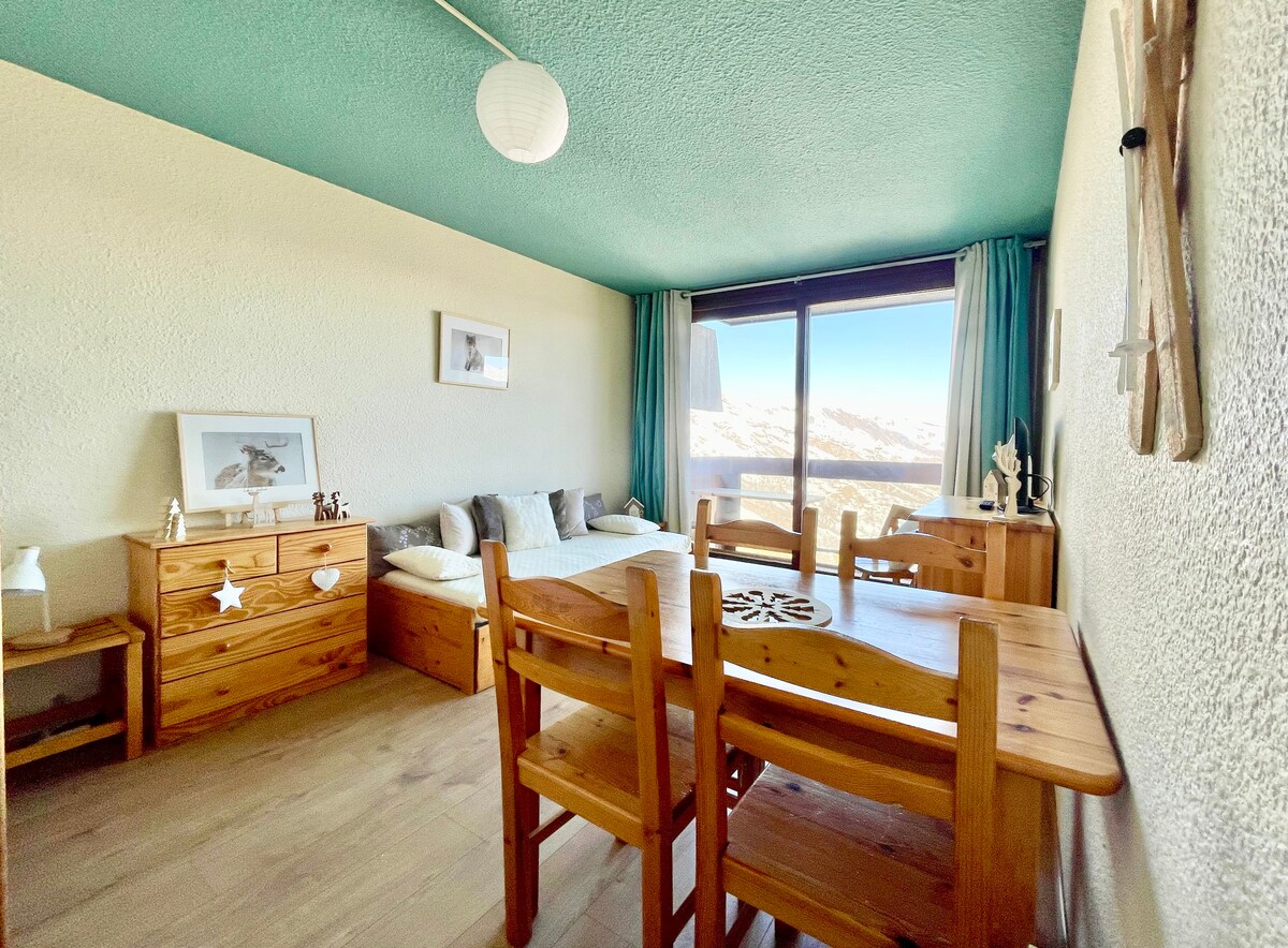 Vue superbe sur les montagnes et la Pierra Menta. Le studio est situรฉ tout en haut de la rรฉsidence Pierra Menta au centre des Arcs 1800, quartier du Charvet. Le studio est confortablement รฉquipรฉ pour 5 personnes. Trรจs calme et lumineux. L'accรจs au centre du village du Charvet est immรฉdiat (commerces, restaurants, parking couvert). Location du dimanche au dimanche (pas de bouchons, cours ESF du lundi au vendredi et surtout le plaisir de skier le samedi, la journรฉe la plus agrรฉable de la semaine).