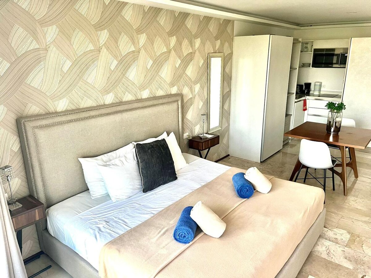 플라야 델 카르멘에서 가장 좋은 위치에 있는 멋진 스튜디오로, 플라야 델 카르멘에서 가장 아름다운 해변 중 하나에서 5분 이내에 해변까지 도보로 이동할 수 있습니다. 아파트에서 바라보는 전망은 모두 자연과 옥상 수영장에서 바다 전망을 감상할 수 있습니다. 카리브해의 놀라운 전망을 감상할 수 있는 옥상 꼭대기에 위치한 헬스장에서 운동할 수도 있습니다. 파노라마 수영장은 일광욕을 즐기기에 좋습니다. 커플이나 친구에게 이상적이며, 아기 침대와 의자는 상황에 따라 달라질 수 있습니다.