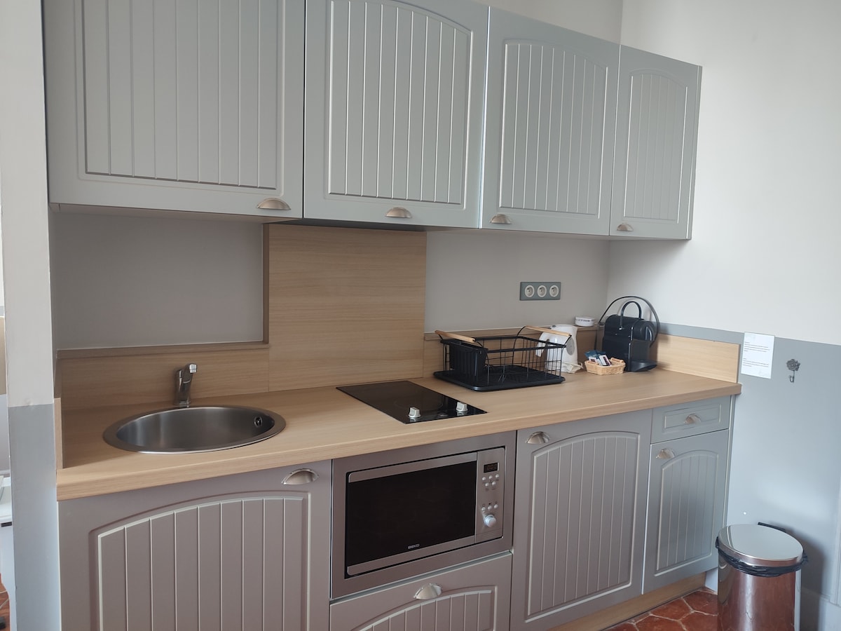 Gîte-studio de 60 m², cour intérieure privative de 20 m², de plain-pied, au cœur de la cité médiévale de Lagrasse, labellisé "Plus beaux villages de France". Bel espace à vivre, avec arche du XVe siècle, cuisine et salle d'eau. Dans le village : baignade surveillée dans la rivière Orbieu, abbaye, église avec orgue classé, exposition sur les plafonds peints, ateliers d'artistes et de créateurs, commerces, restaurants, festivals, animations, randonnées, point d'information touristique.