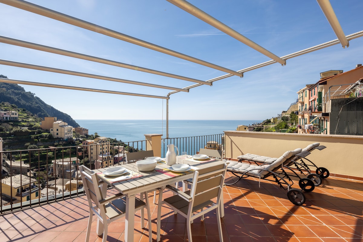 Casa Dena is an exceptional apartment in Riomoggiore. High up in the village with beautiful views of the Mediterranean Sea , Green mountains , and the village. Away from the crowds. The large terrace affords a lovely setting for Dinner , drinks , and sunset watching relaxation. Fully air conditioned with all amenities. Close to restaurants , shopping and cafes. Only a ten minute walk from the train station.