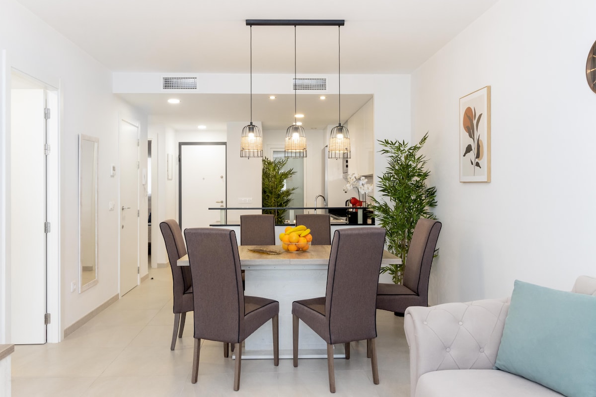 A modern, two-bedroom apartment with a spacious terrace in the heart of Playa Flamenca offers comfortable interiors, two bathrooms, a fully equipped kitchen, a washing machine, a hairdryer, a dishwasher, and air conditioning. Each bedroom and the living room feature a Smart TV. Complex amenities include pools - two of which are heated year-round โ a jacuzzi, sauna, gym, playground, bar, and underground parking. Close to beaches, shops and restaurants. Perfect for an unforgettable stay!