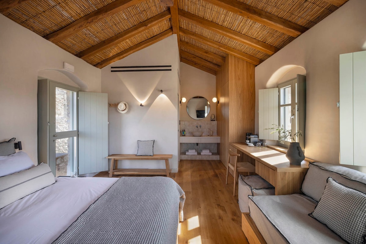 Looking out on to the Aegean Sea from its balcony, this spacious room is fitted with a wood beamed ceiling.