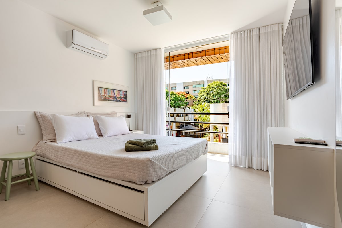 리모델링된 아파트, Mínimo Arq 사무실 디자인 (@minimo arq br). 탁월한 자연 채광과 환기를 갖춘 넓고 통합된 공간은 편안함과 웰빙을 제공합니다. 미니멀한 스타일로 필수 요소를 강조합니다. 상층에 위치한 넓은 발코니는 상층의 늘 신선한 공기를 맞이하며 녹지 전망을 자랑하며, 건물의 독창성을 유지하면서 복원되었습니다. 현대적이고 편안하며 깨끗하고 완벽한 환경을 좋아하는 사람들을 위한 공간입니다. 단기 및 장기 숙박에 적합합니다.