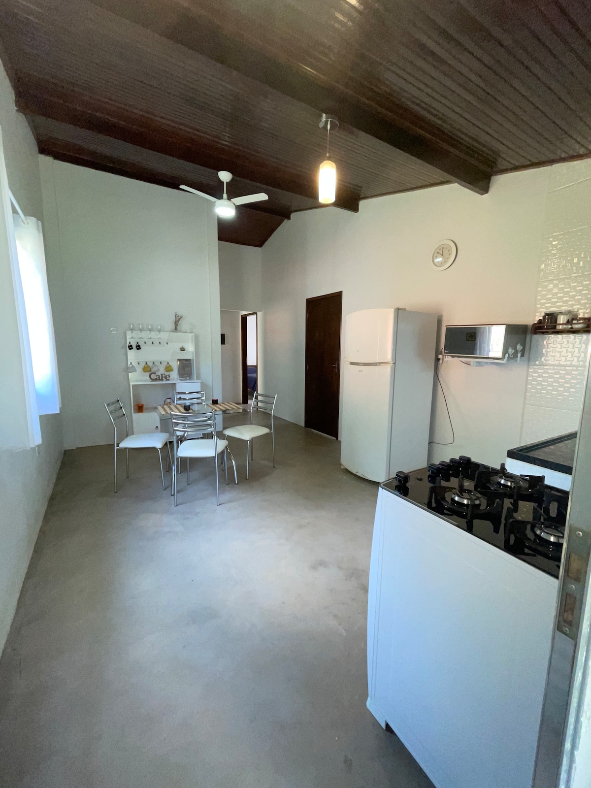 Suíte confortável com 1 cama de casal e 2 camas de solteiro, TV Smart, ventilador de teto, frigobar, mesa para trabalho e espaço para guardar roupas. Varanda com mesas, cadeiras, poltronas, redes, churrasqueira, mesa de ping pong, jogo de dardos e jogos de tabuleiro. Piscina com muito espaço pra tomar sol. Cozinha com fogão, micro-ondas e todos os utensílios necessários. Fire Place. Estacionamento ao lado da suíte. Estamos à 5 minutos do centro da cidade e à 15 minutos da Cachoeira Grande.