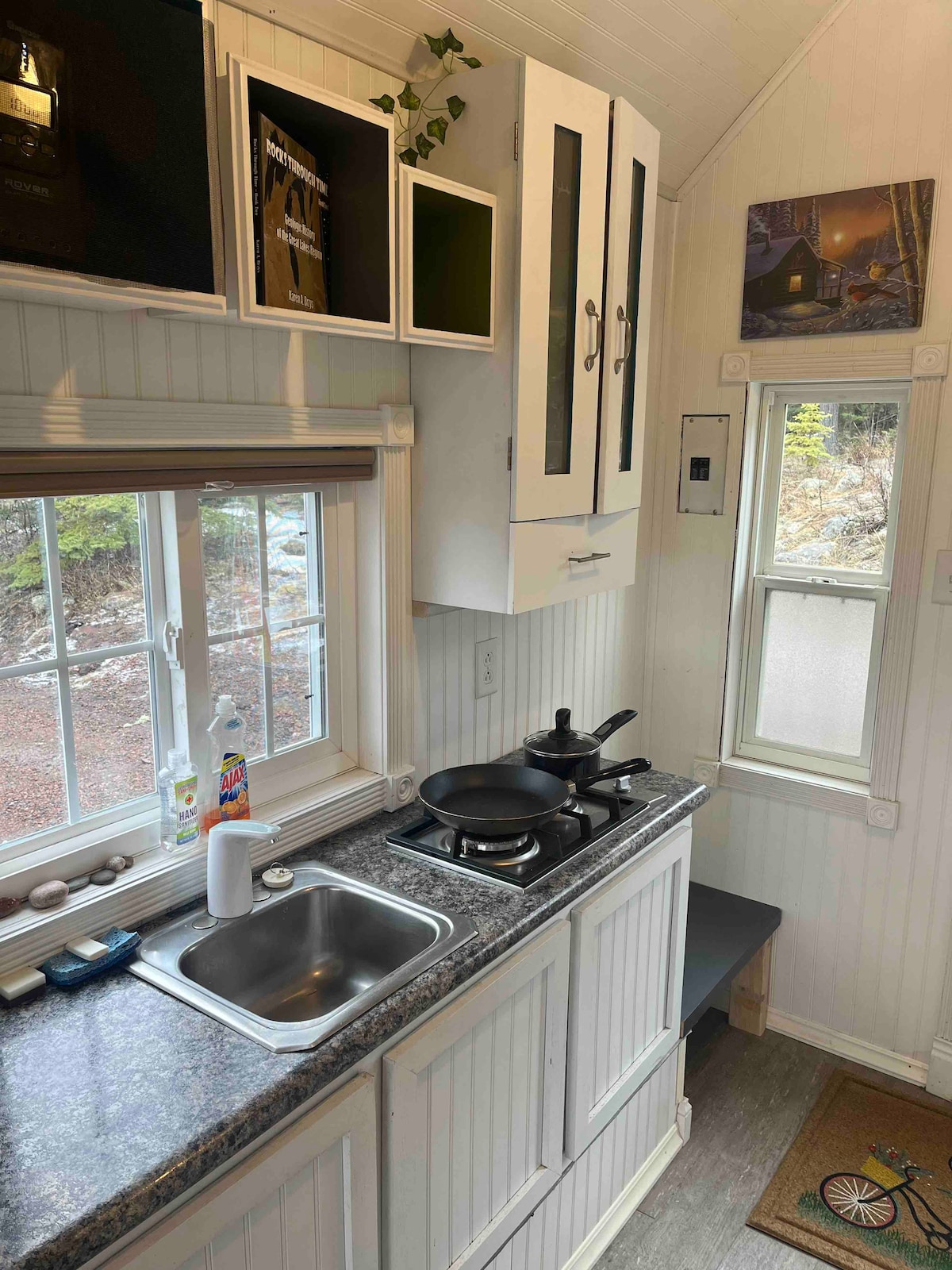 블루베리 힐은 미네소타주 호브랜드의 61번 고속도로에서 조금 떨어진 잘 관리된 전용 도로에 쉽게 접근할 수 있는 8에이커의 전용 부지에 위치한 맞춤형 온수 초소형 주택입니다. 이 작은 숙소는 슈피리어 호수가 내려다보이는 두 개의 편안한 수면 공간을 갖추고 있습니다. 로프트에는 퀸 매트리스가 있고, 아래쪽 공간에는 7피트 길이의 패딩 벤치가 있습니다. 모든 전기는 조명, 콘센트, 미니 냉장고를 공급하는 지붕에 설치된 태양 전지판으로 공급됩니다. 초소형 주택은 너비 8.5 ', 길이 20' 입니다.