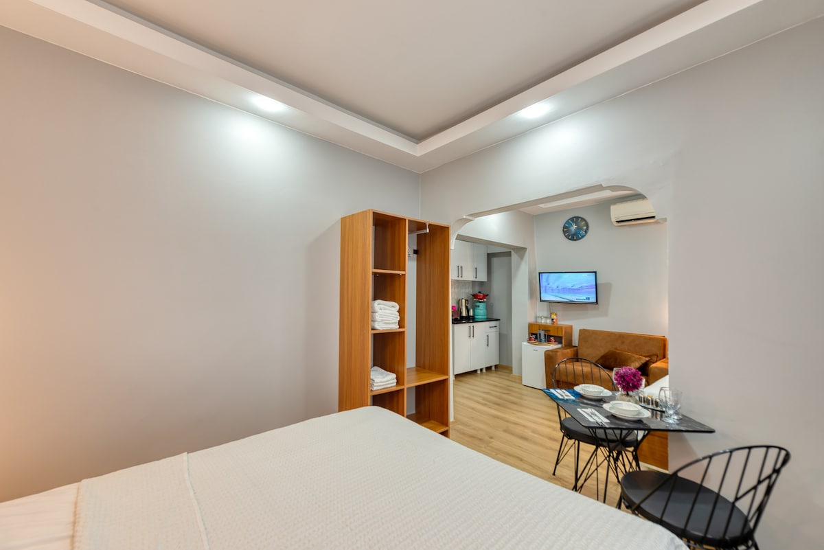 프라이빗 스튜디오 아파트, 술탄아흐메트 구시가지 중심부에 위치한 전용 욕실과 전용 출입구, 모든 주요 역사 명소 블루 술탄아흐메트 모스크 & 하기아 소피아 & 톱카프 궁전 & 지하 수조 및 술탄아흐메트 센터까지 도보로 단 몇 분 거리에 있습니다. 아파트에는 다음과 같은 시설이 갖춰져 있습니다. * 에어컨 * 무료 와이파이 * 위성 채널이 나오는 평면 TV * 정형외과용 매트리스 * 미니 사이즈 주방 * 식탁/의자 * 다리미 및 다리미판 * 헤어드라이어 * 수건, 시트 및 담요, 무료 청소.
