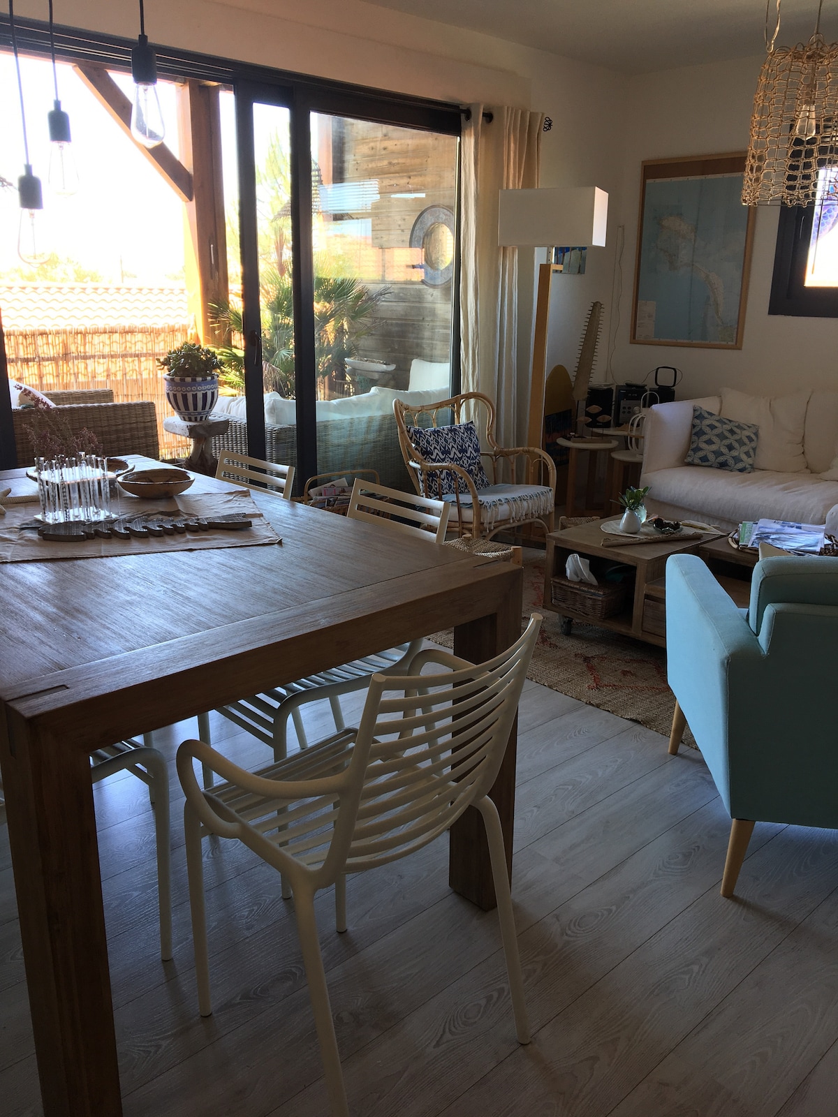 Bordée par la piste cyclable, à 1.5 km du centre ville d'Hossegor et du lac, à 3 km de l'océan, la villa Maui est une superbe villa de standing d'environ 180 m2 avec piscine, grande terrasse en bois et jardin qui affiche un style résolument unique au milieu des pins. Exposée plein sud, spacieuse, décorée avec soin, elle offre tout le confort nécessaire pour 8 personnes.