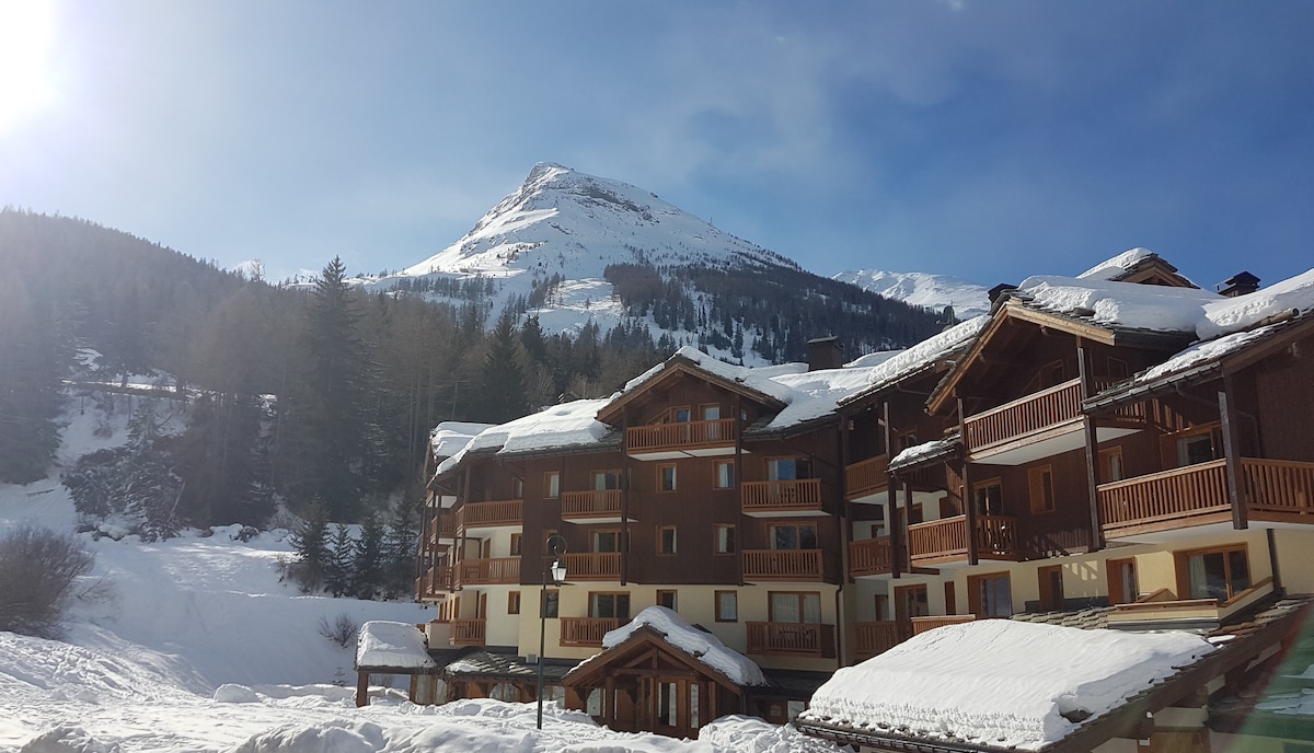 Appartement très confortable 3 pièces / 2 chbres / 6 pers dans un chalet-résidence 4* au pied des pistes, avec piscine, sauna, hammam, jacuzzi, salle de sport. Aussi agréable en hiver avec ses 125 km de pistes qu'en été avec l'accès au parc de la Vanoise, vous profiterez d'une région authentique où le sport et la nature ne font qu'un. Accès au domaine skiable des 3 vallées via la télécabine d'Orelle "3 vallées express" (35/40mn en voiture) et accès à Val d'Isère (en été) via le Col de l'Iseran.