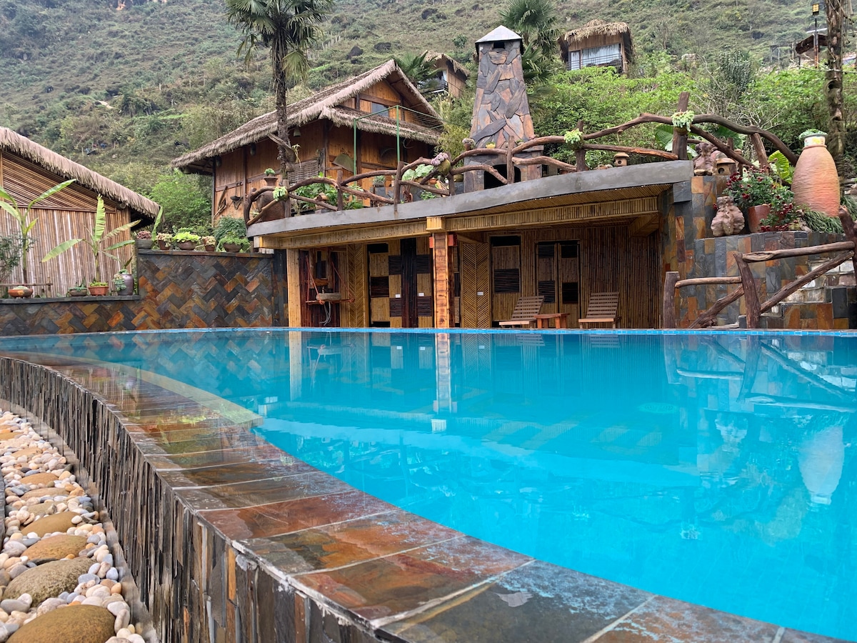 Escape to Vi’s House, a beautifully designed villa just outside Sapa, where modern comfort meets peaceful natural surroundings. The villa features a spacious bedroom with an ensuite bathroom and a charming wooden bathtub, a cozy single bedroom with shared bathroom access, and a large attic with a ground-level double bed - ideal for families or extra guests. It also includes a fully equipped modern kitchen, a small outdoor swimming pool surrounded by greenery, and a tranquil BBQ.