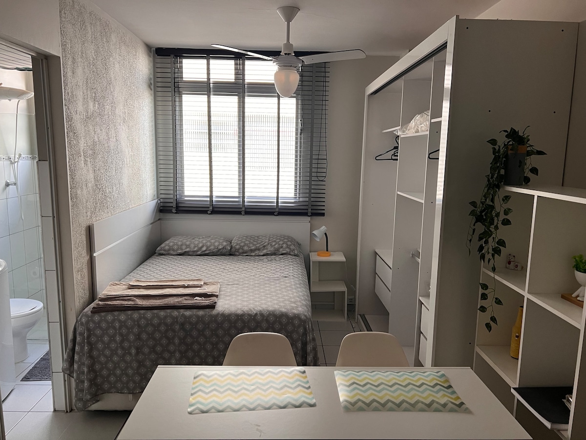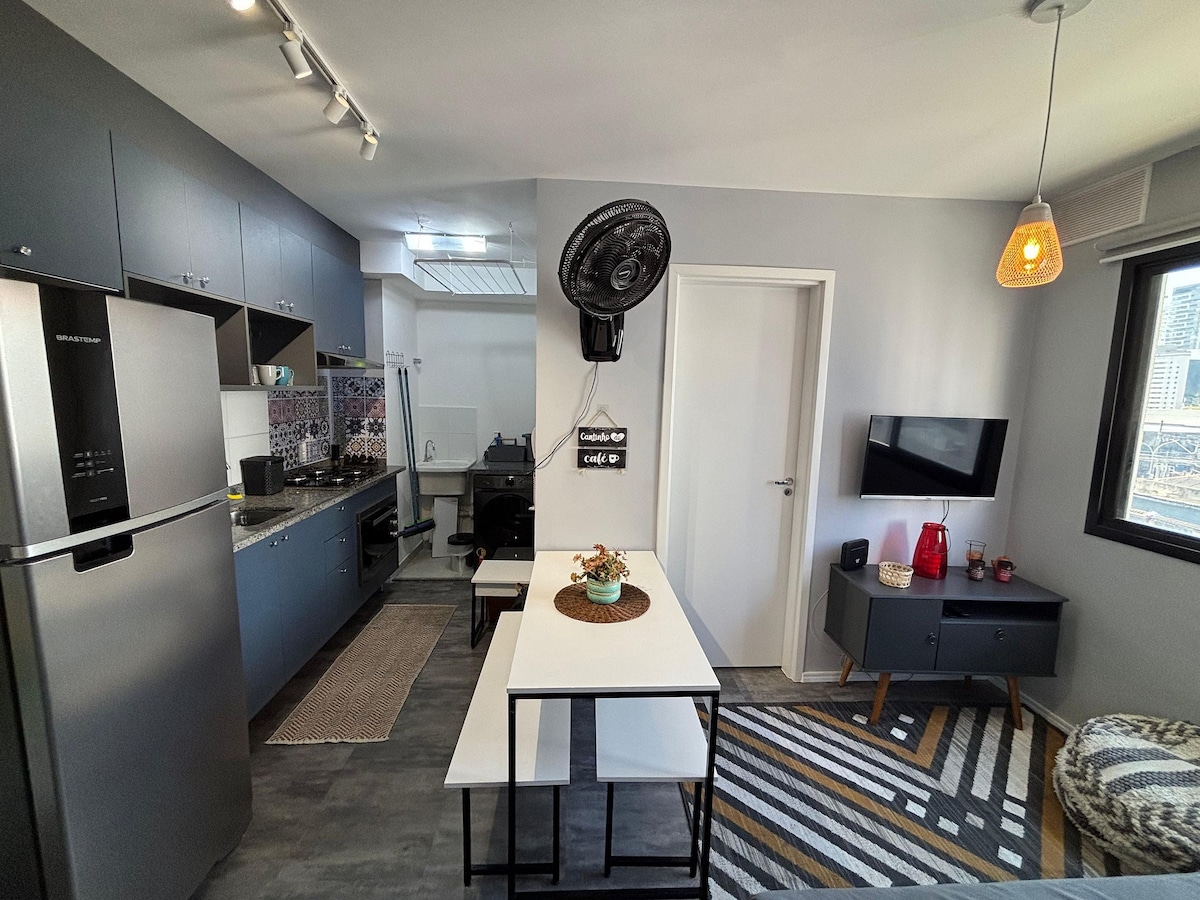 Apto inteiro, novo e aconchegante, bem localizado, à 4 min a pé do Allianz Parque. Ao lado de diversos comércios, meios de transportes, parques, shoppings, pontos turísticos e edifícios empresariais. Apto moderno com 18metros2, possui cama de casal, secador de cabelo, cozinha equipada, cafeteira de cápsulas Nespresso, frigobar, micro-ondas, cooktop de 1 boca, Smart TV e muitas outras comodidades. Tenha a segurança de um cond com portaria 24h. 1 vg de garagem rotativa e sujeito a disponibilidade.