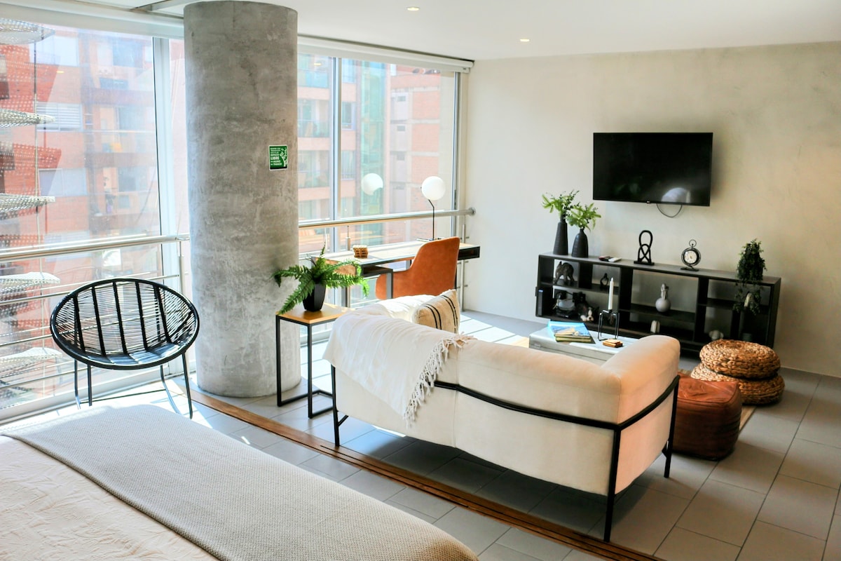 Experience Medellín in this stylish and exclusive open-plan studio near Parque Lleras with private jacuzzi, A/C, king-sized bed, 54" rotating smart TV, Netflix, workspace with high-speed Wi-Fi, fully equipped kitchen, washer/dryer, tea/coffee station, and black-out curtains. Enjoy amazing city views, superb interior design and finishes, gym, sauna, swimming pool, and on-site bars, restaurants, cafeteria, and art gallery — the ultimate exclusive retreat for comfort, style, and vibrant nightlife.