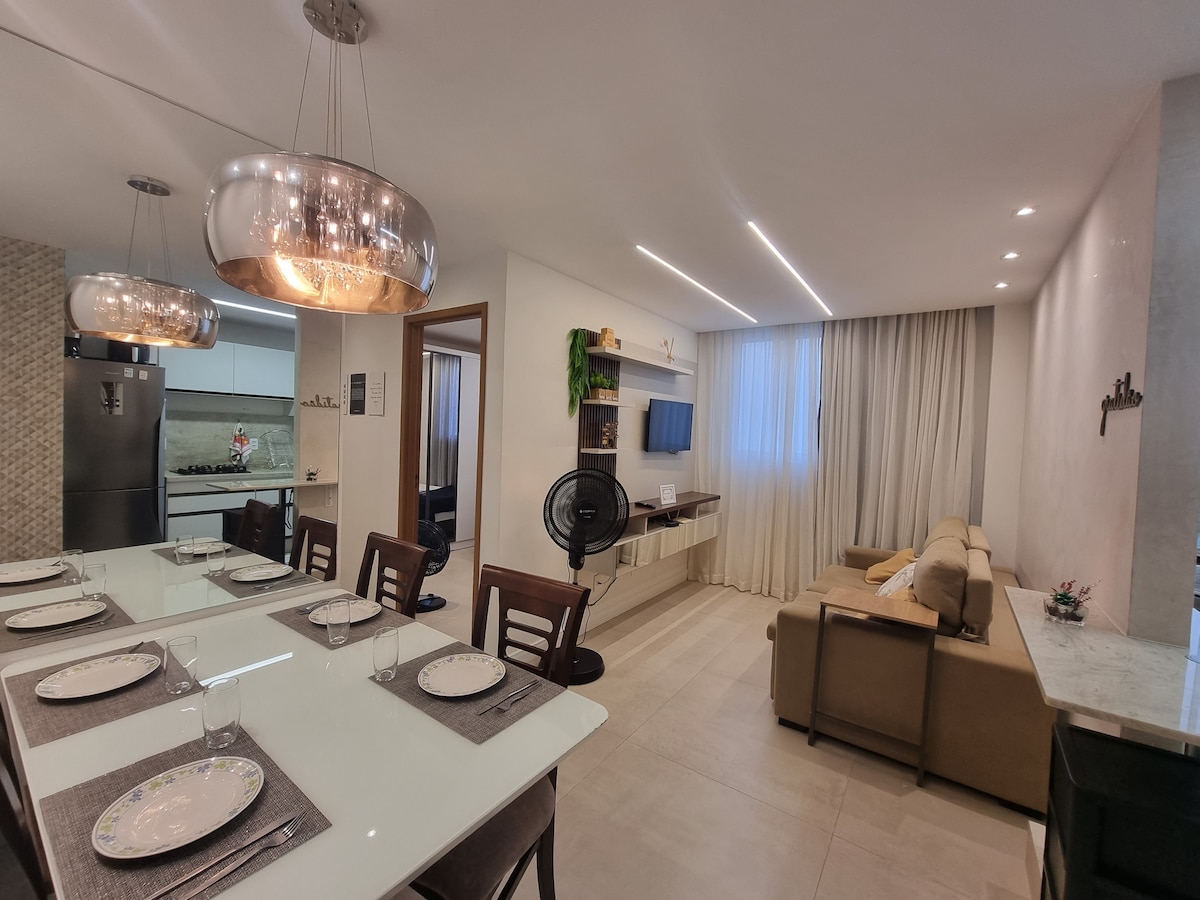 Apartamento aconchegante em um condomínio fechado com segurança e lazer. De carro fica a 15 minutos do aeroporto e 8 minutos da praia. Com tudo o que você precisa para ter uma estadia agradável e ser capaz de se desconectar e desfrutar com a família ou amigos, neste espaço equipado você vai se sentir em casa. - Próximo a supermercados, Parque Shopping Bahia, Universidade Unime, restaurantes, bares e farmácia.