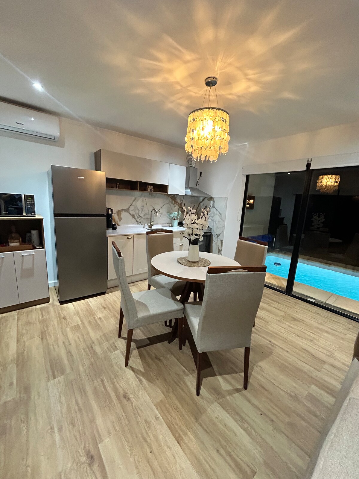 Casa Empoderada Un lugar mágico en el bosque de Villa Serrana. La casa cuenta con: Piscina climatizada privada, jacuzzi para 2 personas, churrasquera techada, 2 aires acondicionados, cocina equipada, Wi-Fi, Netflix, 1 cama matrimonial, sofá,TV de 43. NO INCLUYE: Sábanas,toallas,leña,jabón corporal,shampoo,acondicionador. Check in 15:00 hs Check out 12:00 hs