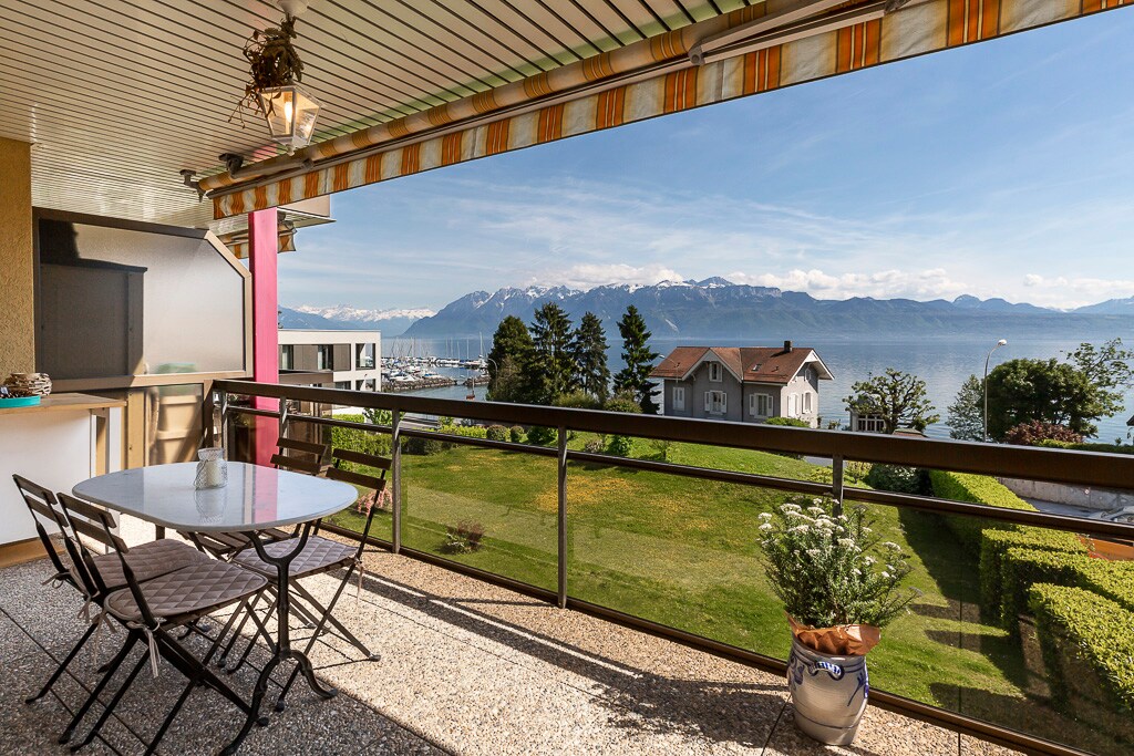 Beautiful flat of 110m2 with two bedrooms, a private garden, terrace and spacious veranda. It also has a large living room and a beautiful dining room/kitchen. The place is tastefully decorated. The view is panoramic on the lake and the mountains. The entrance to the A9 motorway is 3 minutes away. Many walks in the Lavaux vineyards are possible directly from the house. 5 minutes away from the beach of Rivaz (Lake Geneva) and 30 minutes from the mountains!
