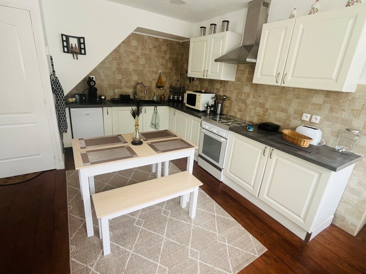 이 가족 숙소는 모든 관광지와 편의시설에 가깝습니다. 마을 한가운데(50m 거리에 있는 슈퍼마켓)에서 시골의 모든 혜택을 누릴 수 있습니다... 넓고 깨끗한 거실은 아늑한 분위기를 제공합니다. 1층에는 킹사이즈 침대 1개와 욕실 1개, 거실 1개, 주방 1개가 있습니다. 2층에는 전기 침대 2개(90 x 200)와 욕실 1개, 사무실 공간 1개가 있습니다. 주차장, 슈퍼마켓, 전기차 충전소가 50m 거리에 있습니다.