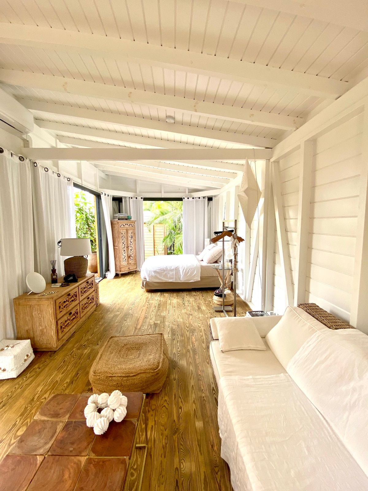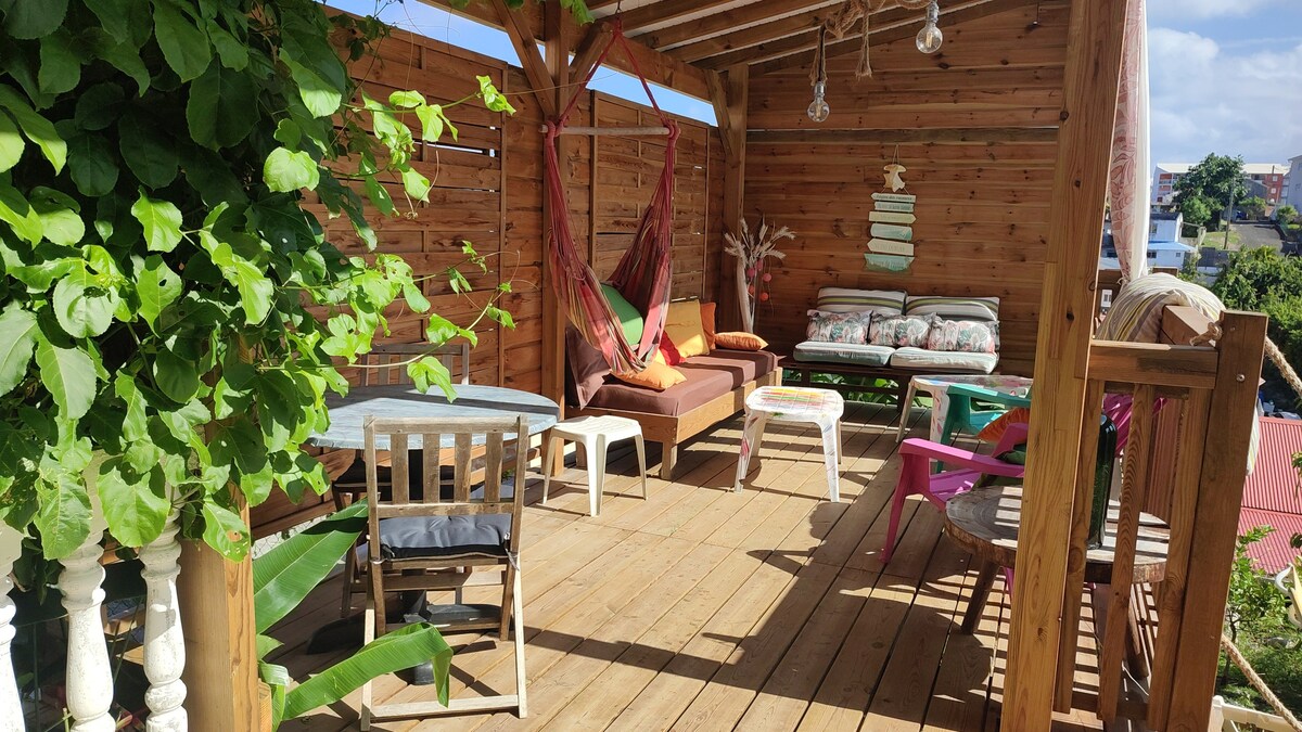 La terrasse fait sortir un avocatier du deck...ombrage naturel... le bruit de la mer comme fond, quartier calme, ambiance tropical mais tout prêt d'une plage, à pieds 1 minute et demi. Bungalow sur pilotis, dans jardin fleuri. Chambre climatisée, petit salon avec un canapé, TV cablé, tout confort pour cuisiner, grille pain, micro onde. Avec le chauffe eau solaire, si pendant 2 ou 3 jours il n'y a pas du tout de soleil, l'eau sera tiède, c'est rare quand même!