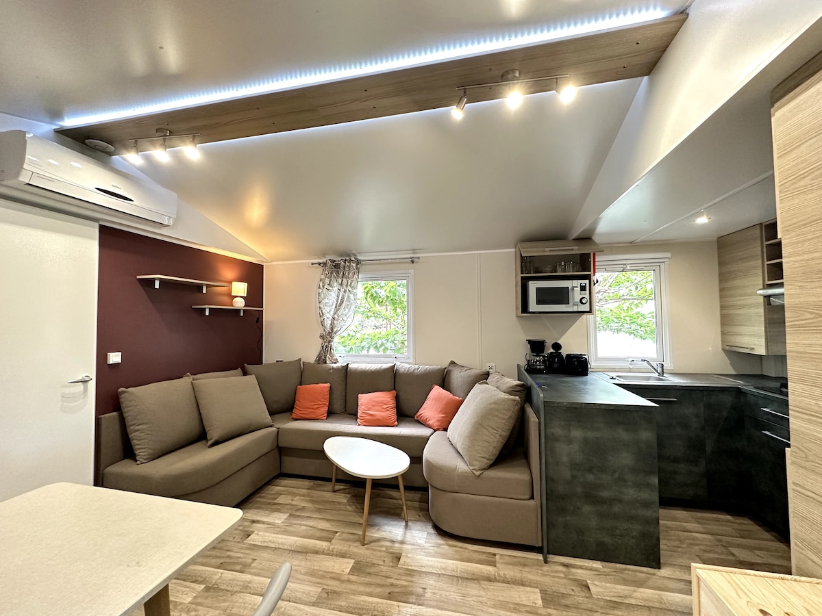 Profitez d'un sรฉjour tout confort dans un camping 4 รฉtoiles au coeur d'un parc naturel arborรฉ ร deux pas des plages de Palavas les Flots, du centre ville de Montpellier ou ร 30 mn de Nรฎmes et de la Camargue. Venez dรฉcouvrir notre Mobil-Home rรฉcent IRM AVENTURA 2 DE 40M2 avec 2 chambres 2 salle de bain tout รฉquipรฉ,climatisรฉ et sa terrasse extรฉrieure couverte, son jardin privatif qui vous permettrons des moments privilรฉgiรฉs a l'abri des regards et du bruit. Mรฉnage et linge de lit inclus.