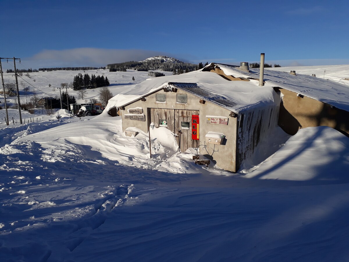 La Porte du Chardonnet Gite et chambre d'hôtes 8 route du Gerbier de Jonc, 70 m au dessous de l’office de tourisme. Au pied du Mont Mézenc, une famille d´éleveur vous accueille. Location 5 personnes dans le village des Estables, au coeur de la station de ski. Appartement de 50m² de plain-pied, au rez-de-chaussée de la maison des propriétaires fermiers. Séjour-cuisine (toute équipée), 2 chambres (2 lits 2 personnes140 x190, 1 lit 1 personne 90x190 , 1 lit bébé). Jardin. Chauffage central compris.