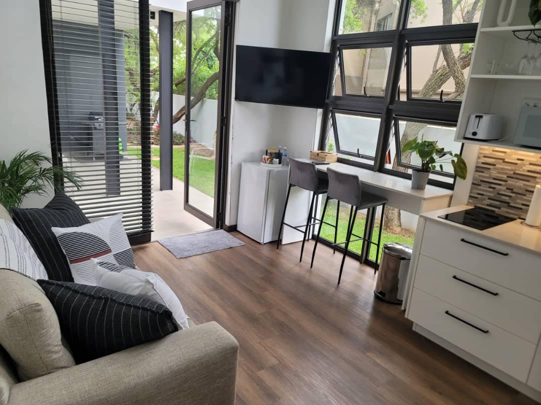 Baobab Self-Catering Suite can accommodate 2 people. Discover tranquility in our Baobab Suite, perfect for any traveller. Enjoy a private entrance, open-plan living area, full kitchen, workstation, and free WiFi. Unwind in the modern bedroom with a queen size bed and en-suite bathroom. The suite boasts views of lush gardens and a beautiful pool. Includes free parking and a Smart TV. Close to attractions, dining, nature reserves, and shopping. Ideal for relaxation or a productive stay.