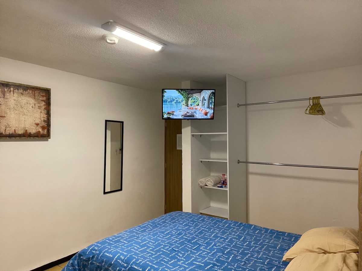 Habitación básica con cama matrimonial para huéspedes en lugar seguro, cerrado, con acceso a internet de alta velocidad. Estacionamiento dentro de la propiedad. Nos encontramos a 10 minutos del aeropuerto internacional del bajío a las afueras de la ciudad de Léon.