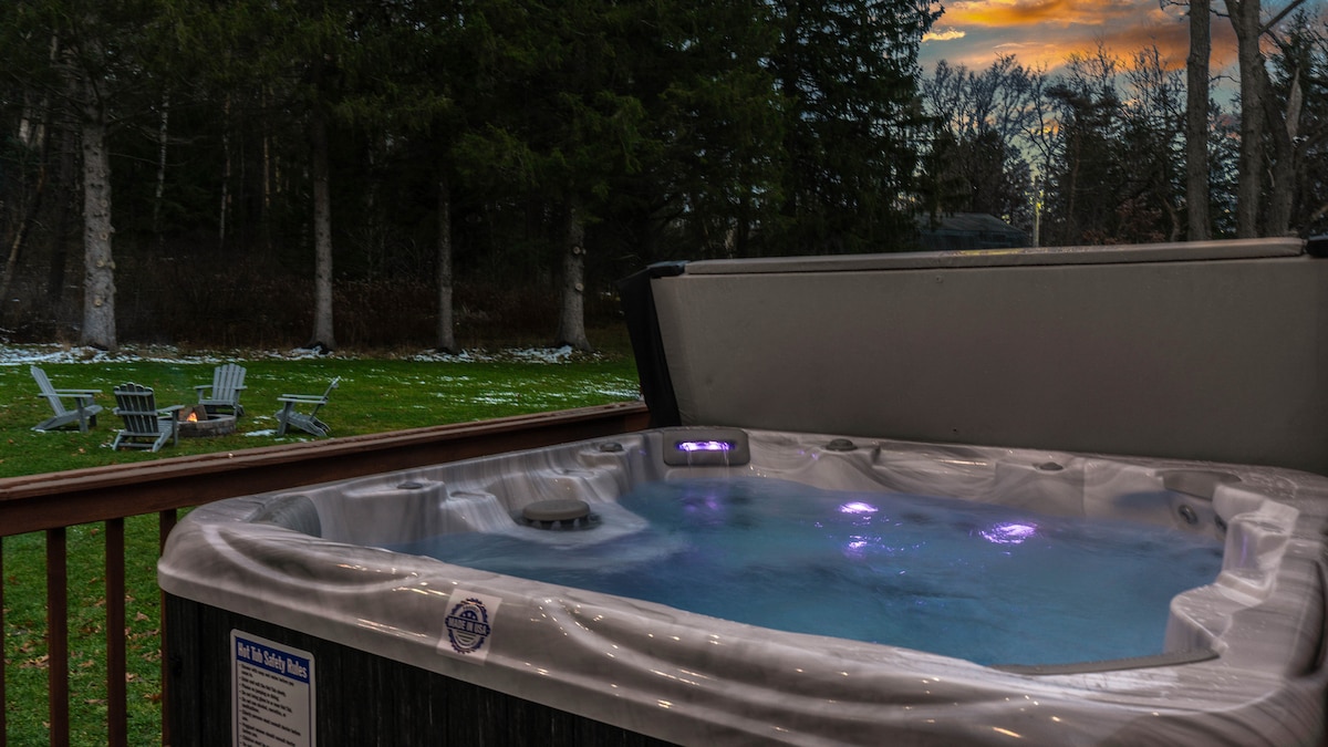 Located just two miles from the Village of Ellicottville, The Pines on Maples offers stunning views & a variety of amenities for relaxation and entertainment. Tucked away in the rolling hills of Western New York, this chalet features a large wood deck with a Weber grill & sitting area, as well as a walk-down path to an eight-person hot tub & an unilock fire pit with Adirondack chairs. State of the art Stuv indoor fireplace for cozy cabin days!!