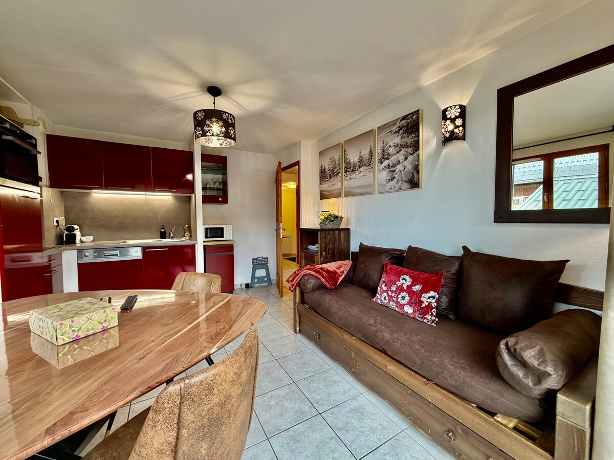 Petit studio cosy et chaleureux entièrement rénové. Nous y avons mis beaucoup de cœur et nous serons ravies de vous accueillir pour que vous passiez un très bon séjour. Il se trouve au bord des pistes, vous pourrez rentrer directement à la résidence en skis ❄️ Il dispose d'une piscine ouverte de juin à septembre ☀️ Jolie vue sur le Mont-Blanc 😎🏔️ N'hésitez pas à nous joindre, nous vous répondrons rapidement et nous ferons en sorte que votre séjour se passe au mieux ☺️