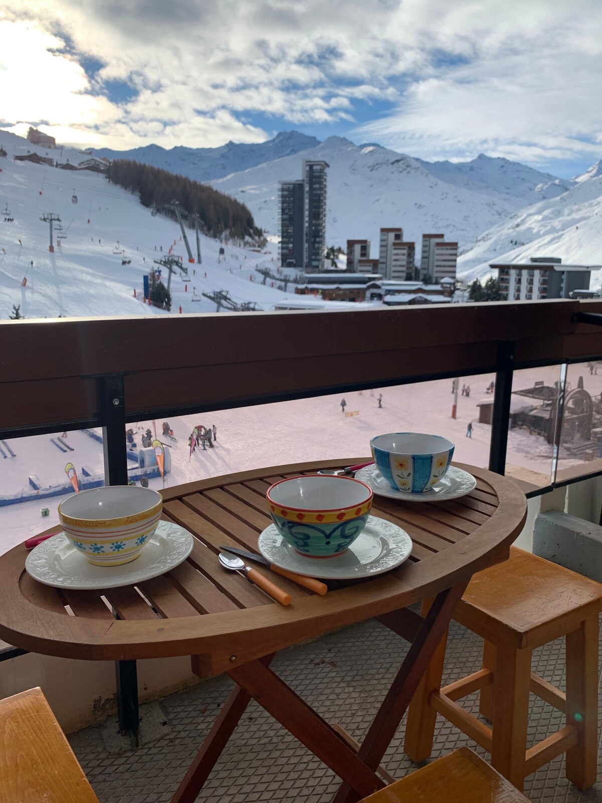 Vous recherchez un hébergement sur VAL-THORENS pour un séjour d'une semaine entre amis ou en famille (6 Pers.) ? Vous venez de trouver ce qu'il vous faut. Endroit calme, idéal pour se ressourcer, à l’écart du bruit mais pas trop éloigné pour pouvoir profiter de la station. Tout à pied … et avec vue panoramique sur les sommets et les pistes. - Place CARON (via la galerie) à moins de 300 mètres - Gare routière à moins de 200 mètres - Pistes à moins de 100 mètres - Parking P1 à moins de 200 mètres