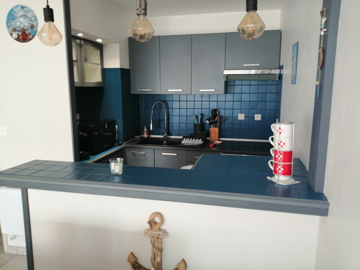 사블 중심부에 위치한 80㎡ 이상의 아파트로 차고가 있습니다. 테라스가 있는 침실 2개, 소파 베드가 있는 넓은 거실 공간. 주방 시설 완비(오븐, 식기 세척기, 전자레인지...). 세해에 세탁기가 있습니다. 매우 밝고 2층짜리 작은 건물의 1층 전체를 차지합니다. 상점, 아라고 시장, 해변까지 도보로 이동 가능. 차고에서 잠수복을 헹구고 서핑 보드를 보관할 수 있습니다. 성인용 자전거 2대 이용 가능.