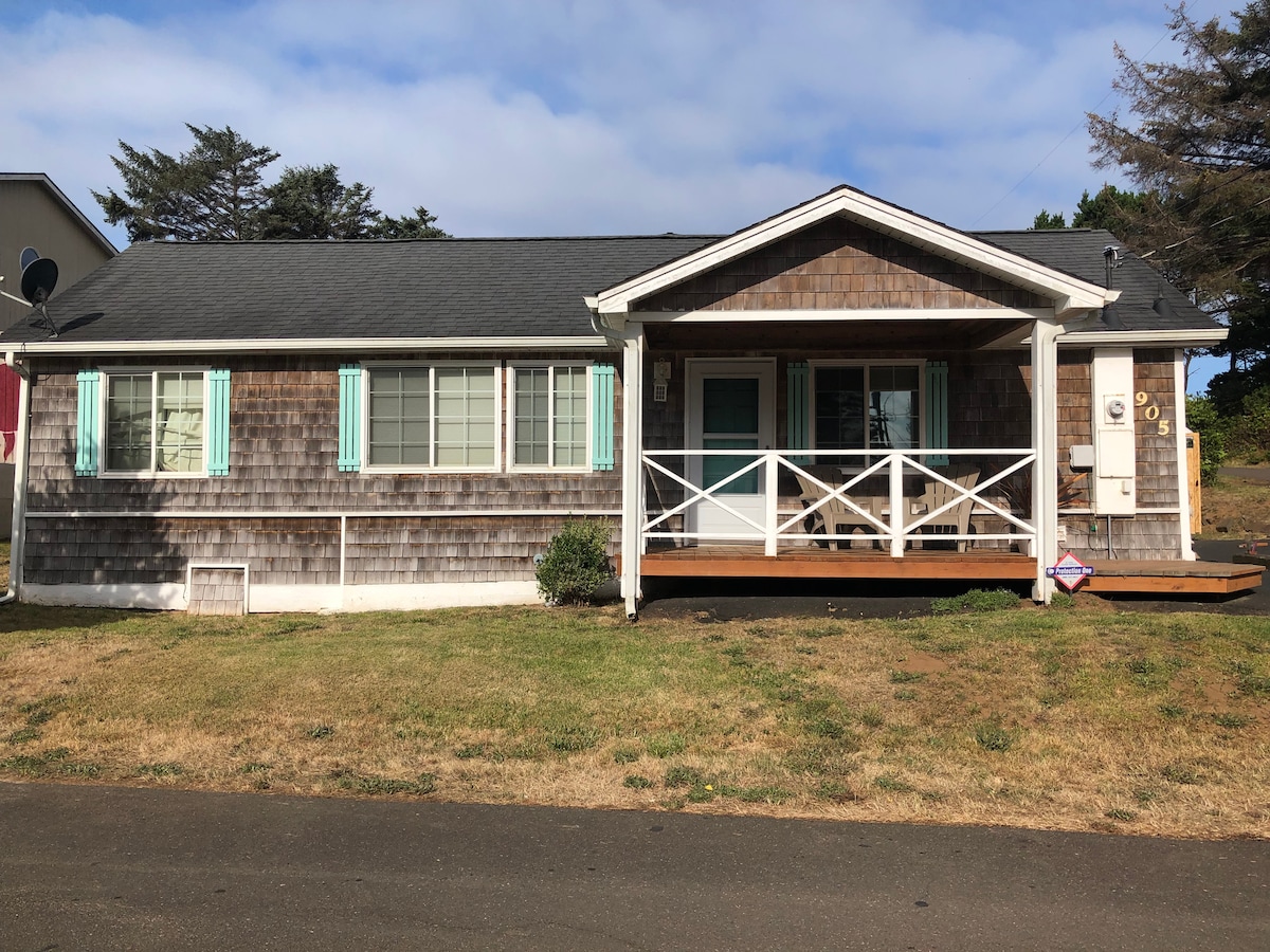 Beach cottage, newly remodeled, nestled in a quiet neighborhood, a short walk to 11 st beach access, outlet mall and well known restaurants. You'll find total relaxation by the fire on the patio, in the hot tub under the stars or with a cup of coffee on the deck as the sun rises. A couple yards away from an ocean bluff where the sun sets are breathtaking. 2 bedroom, 2 full baths, full kitchen, laundry, patio, hot tub and hide-a-bed.