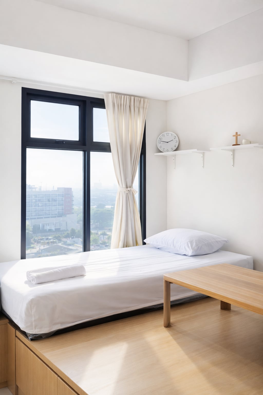 세련되고 편안한 아파트에서 최고의 도시 생활을 경험해보세요. 이 현대적인 공간에는 아늑한 침실 3개, 시설이 완비된 주방, 추가 간식과 음료와 함께 휴식을 취하기에 완벽한 편안한 거실 공간이 있습니다. 또한 멀티모드 트랜스자카르타 (0km), 경전철 (2km), KRL (400m), 버스 (400m) 및 수영장, 워터파크, 풋살 및 농구 코트와 같은 운동 기구를 갖추고 있습니다. 건물에서 단 5걸음 거리에 트랜스파크 몰, XXI, 스노우 월드도 있습니다.