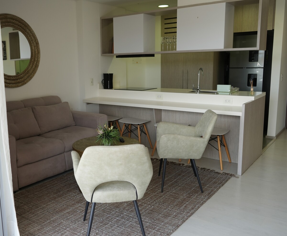 Modern apartment in an exclusive area of Llanogrande, just 10 min from Rionegro Airport and close to restaurants, shops, and a sports club. Enjoy a hotel-style stay with cleaning included (except Sundays and holidays) and access to a pool, jacuzzi, sauna, steam room, and gym. Only 40 min from Medellín. Private parking and 24/7 security for peace of mind.