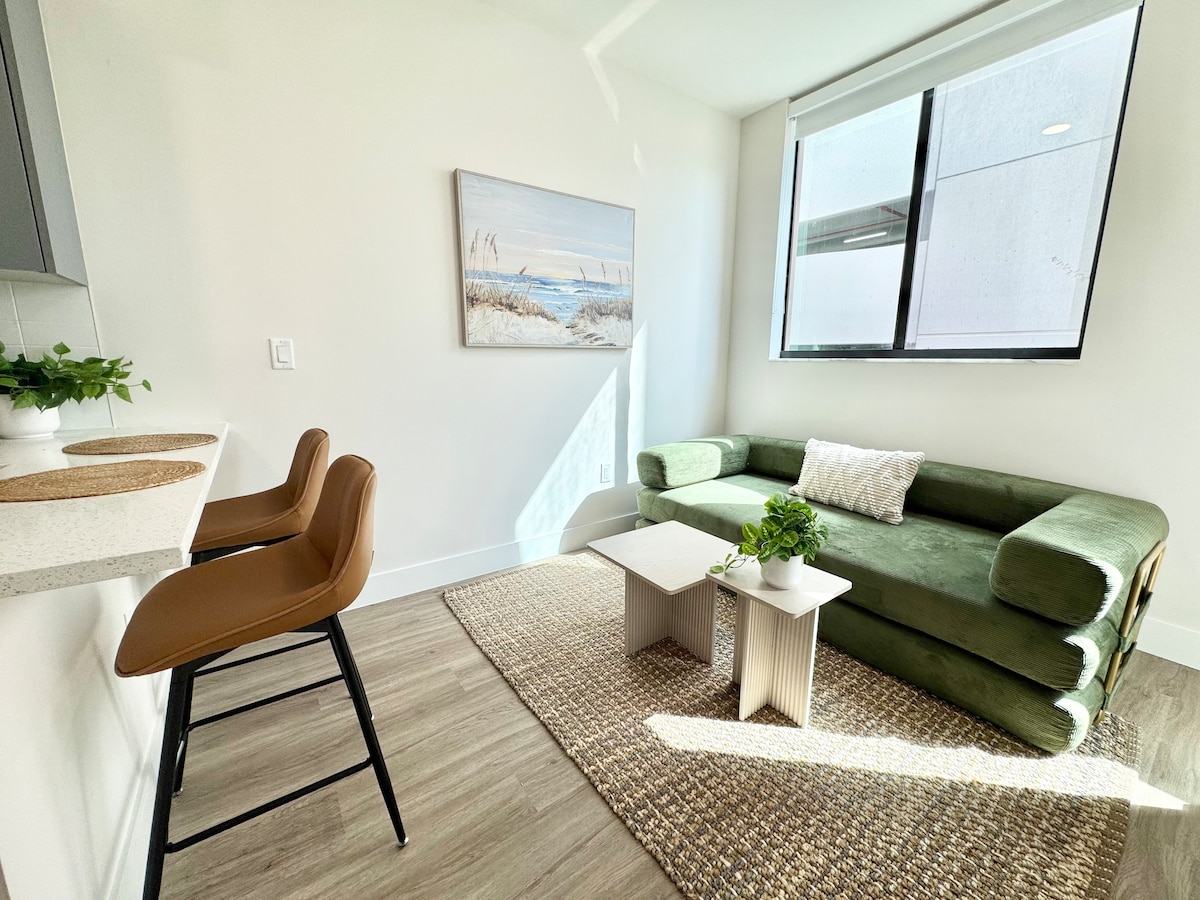 현대적인 인테리어, 침실 2개, 욕실 1개, 넓은 거실이 있는 세련된 아파트를 즐겨보세요. 마스터 침실에는 킹사이즈 침대와 40인치 스마트 로쿠 TV가 있으며, 두 번째 침실에는 퀸사이즈 침대가 있습니다. 미드 센추리 소파, 우아한 식사 공간, 새로운 스테인리스 스틸 가전제품, 전자레인지, 냉장고, 스토브, 오븐, 커피 머신이 완비된 주방을 갖추고 있습니다. 스테인레스 스틸 기구는 현대적인 디자인을 보완합니다. 중심부에 위치한 내 집처럼 완벽한 집입니다!