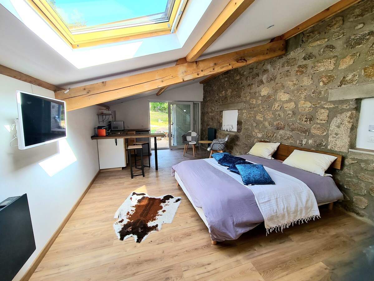 Au pied des Monts de la Madeleine à 20 minutes de la ville de Roanne , à 600 m du village classé d'Ambierle offrant toutes commodités , dans un lieu atypique qui était autrefois une ancienne scierie , nous vous proposons cette chambre meublée point de départ idéal pour des randonnées pédestres , VTT ou moto et partir à la découverte de notre belle région.
