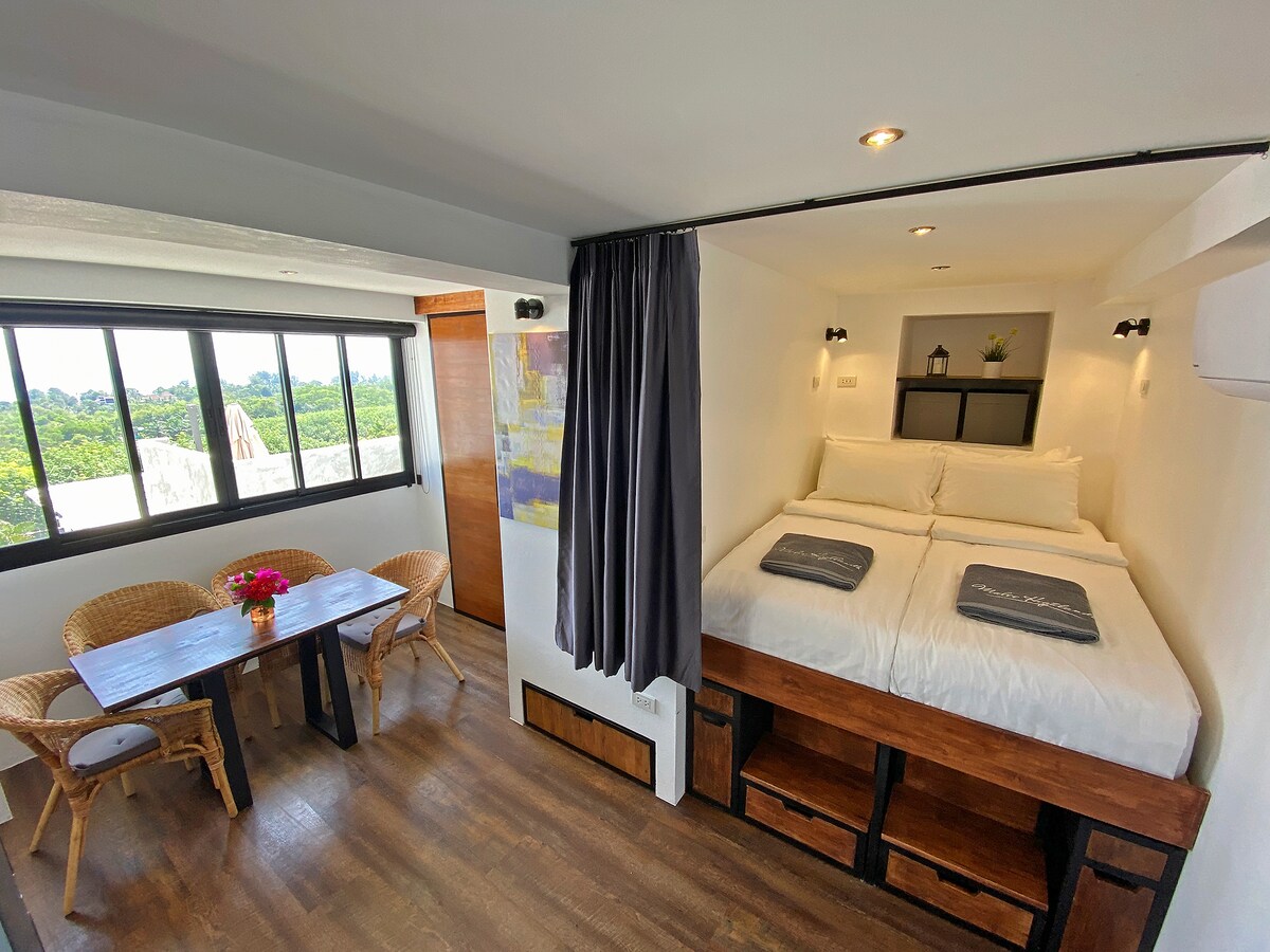 클롱다오 해변까지 도보로 단 2분 거리에 있는 이 기발하게 디자인된 2층 소형 주택에서 나만의 휴식을 즐겨보세요. 숙소: 미니멀한 디자인과 최고의 편안함이 어우러진 이 독특한 소형 복층 주택을 만나보세요. 아래층에는 아늑한 거실 공간, 시설이 잘 갖춰진 간이 주방, 전용 욕실이 있으며, 위층 로프트에는 매력적인 박공 지붕 아래 평화로운 수면 공간이 마련되어 있습니다.
