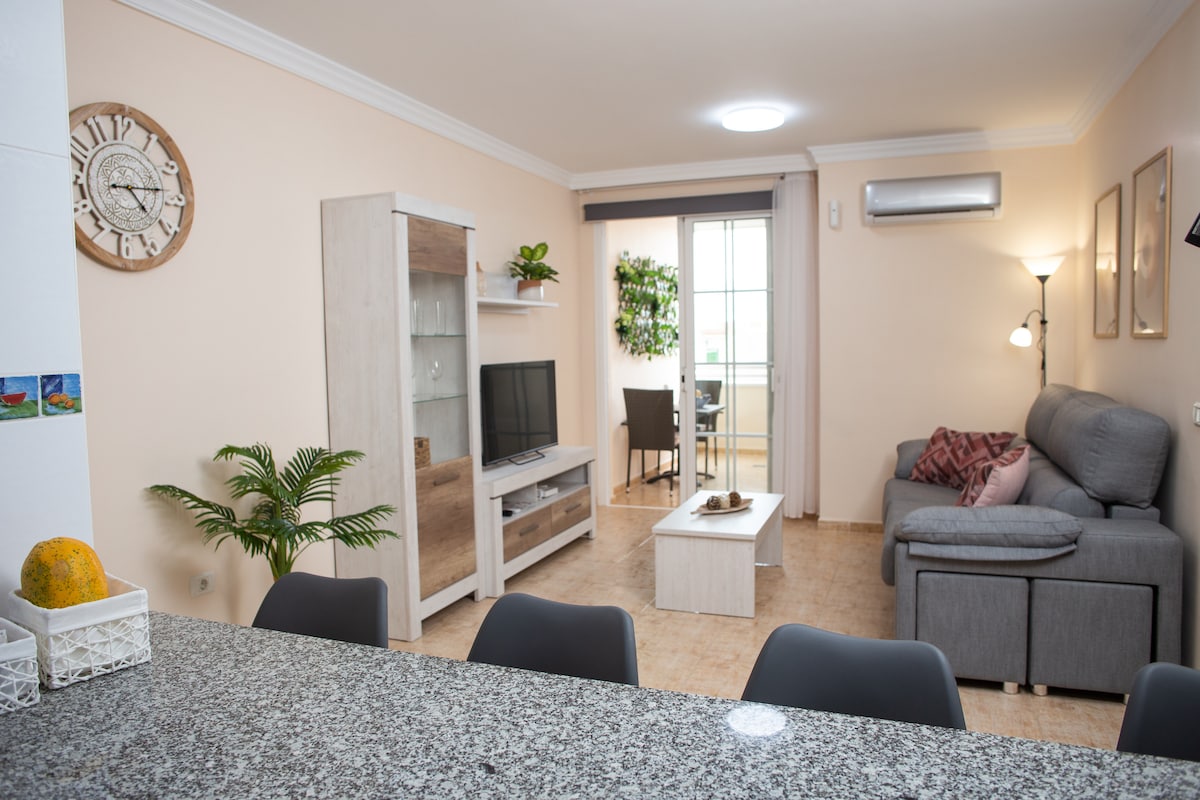 Welcome to our cozy seafront home in Oasis del Sur, Tenerife! Overlooking the tranquil waters of Golf del Sur, our attached town-house offers a peaceful escape for families, couples or friends seeking serenity. Relax and unwind in our well-decorated and functional space, complete with two double bedrooms, two shower rooms, and a sun-drenched terrace perfect for soaking up the sun. Take a dip in the seawater heated pool or catch up on your favorite shows with the Smart TV and high-speed WiFi.