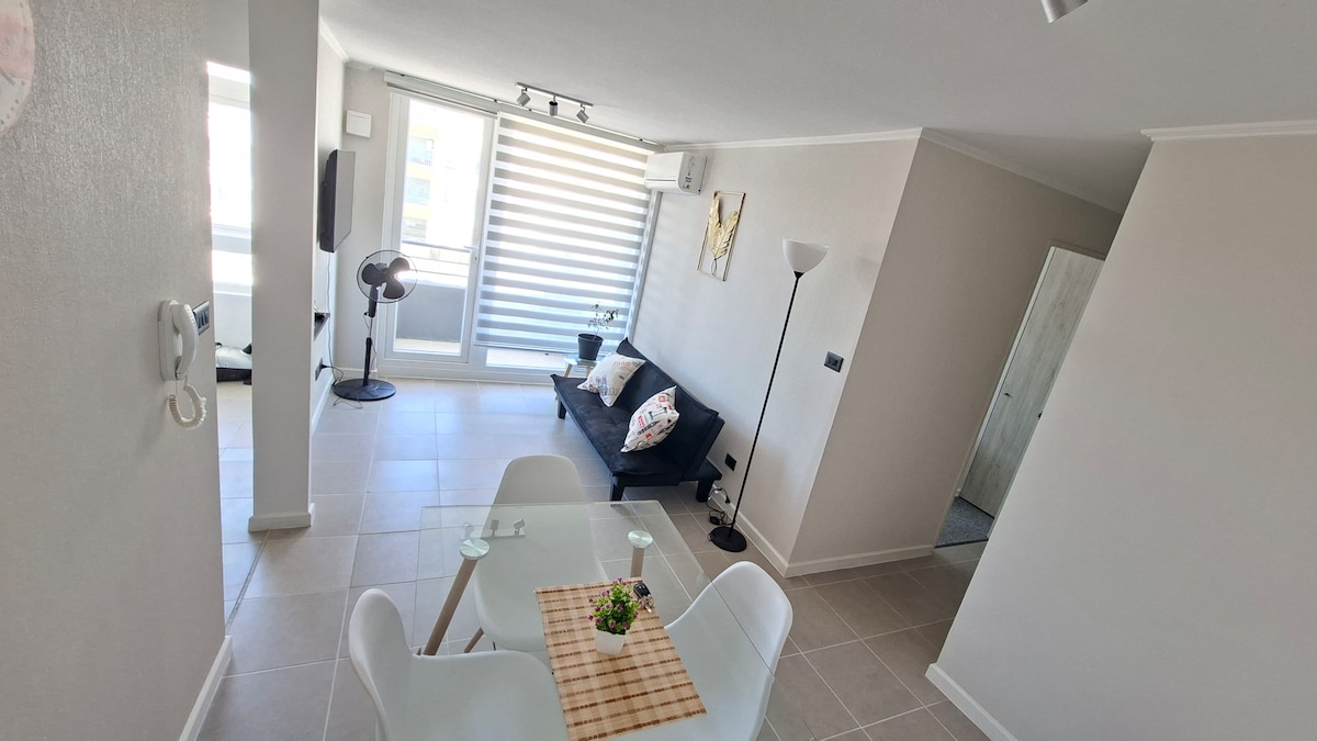 Acondicionado para tus estadías cortas o vacacionales! departamento de 1 dormitorio habilitado con cama de 2 plazas y Futon! (para un tercer acompañante🫶) A 3 cuadras de Supermercardo, restaurantes/cafés y locomoción colectiva. Cafetera y café de regalo para comenzar tus mañanas! ☕️