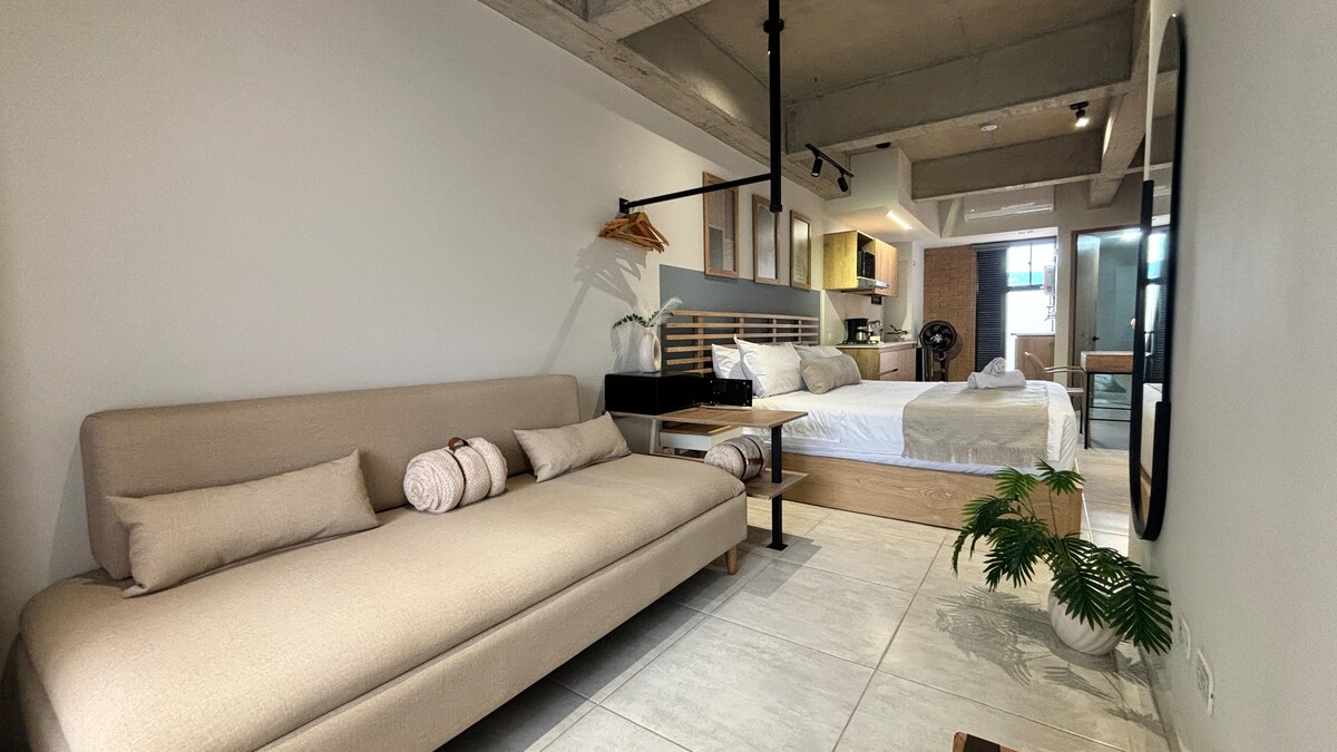 Experience Medellín from this stylish and inviting duplex with a modern urban feel. The bedroom is on the lower level, while the living room, kitchen, and bathroom are upstairs with a comfortable flow between spaces. Street-facing windows fill the home with natural light and fresh air. Located in a walkable, vibrant neighborhood with easy access to public transportation, cafés, supermarkets, and restaurants. High-speed internet makes it ideal for remote work and city explorers alike.