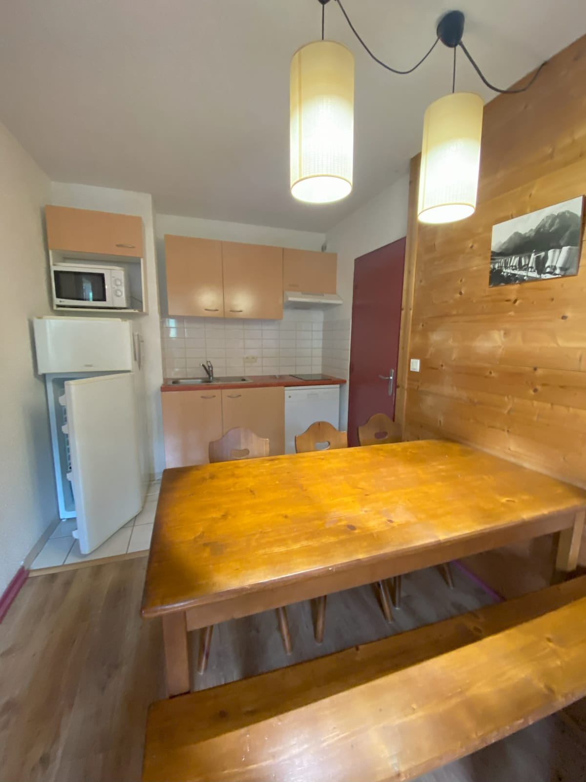 Studio 4 personnes exposé sud de 28 m2. Composé d'une entrée avec deux lits superposés en 90, salle de bain et toilettes séparés, un séjour équipé d'un canapé/lit 2 places, donnant sur un balcon/terrasse. Coin cuisine dans le séjour équipé de plaques vitrocéramiques, four micro-ondes, lave-vaisselle, réfrigérateur, vaisselle... L'appartement dispose d'un casier à skis privé. Accès GRATUIT à la piscine et à la salle de fitness. Une laverie est disponible au niveau de l'accueil de la résidence.
