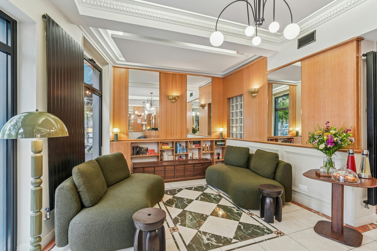 The Relais Bosquet hotel invites you to enjoy comfort space and peacefulness in a fully equipped air conditioned room with your choice of two single beds or a double bed. Relax in a soundproofed, non smoking space with a minibar, safe and themed TV channels. Thoughtful amenities include free WiFi, ironing facilities and PRM accessibility. Unwind in a private bathroom with shower or bath and wake up refreshed for your Parisian adventures.