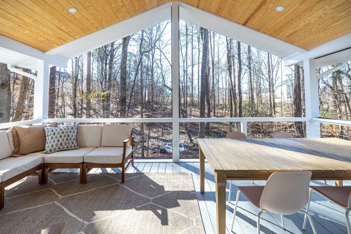 You’ll feel like you’re getting away from it all in this modern, private tiny house in the trees, even though you’re just minutes from Duke, downtown Durham, shopping, and restaurants. It’s the perfect balance of peaceful retreat and city convenience. The home includes all the essentials — full kitchen, laundry, A/C, and high-speed internet — but many guests find themselves spending most of their time relaxing on the screened-in porch, listening to birds, and recharging.