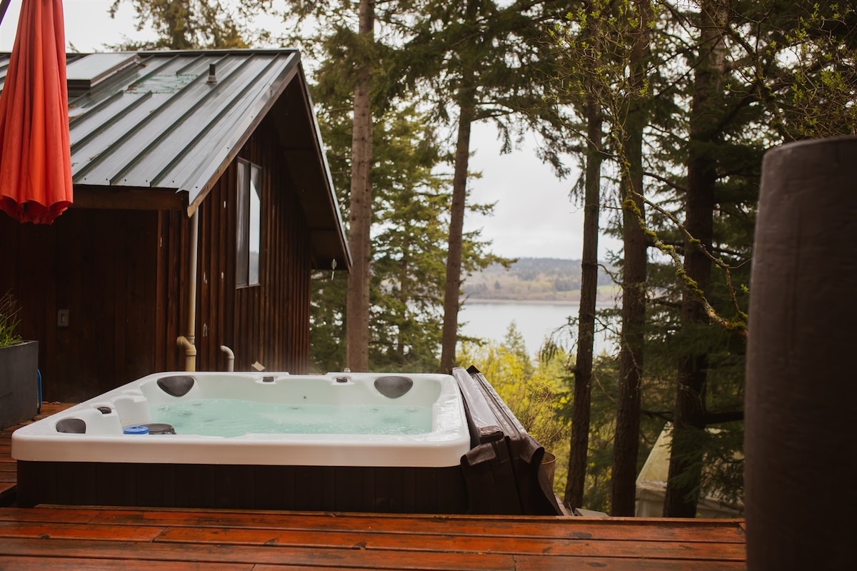 아름다운 전망과 온수 욕조가 있는 숲속 호숫가 통나무집