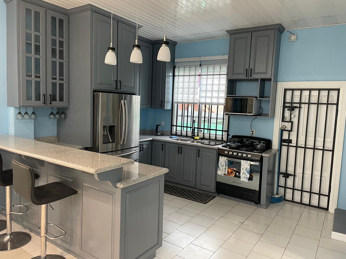 내 집처럼 편안한 숙소에 오신 것을 환영합니다. 조지타운 중심부에 위치한 새로 지어진 아늑하고 활기차며 현대적인 숙소입니다! 슈퍼마켓, 주유소, 쇼핑몰, 택시 및 기타 편의시설에서 몇 분 거리에 완벽하게 위치하고 있습니다. 문을 열고 들어서면 숨이 멎을 정도로 아름다운 곳입니다. 개방형 콘셉트 레이아웃 평면도로 구성되어 있습니다. 이 3베드룸 셀프 컨테인은 퀸 스위트, 50인치 스마트 TV, 알렉사, 온수 및 냉수, 옷장으로 구성되어 있습니다. 이 숙소에는 최신 편의시설이 포함되어 있습니다. 오글 공항에서 10분, CJIA에서 차로 50분 거리에 있습니다.