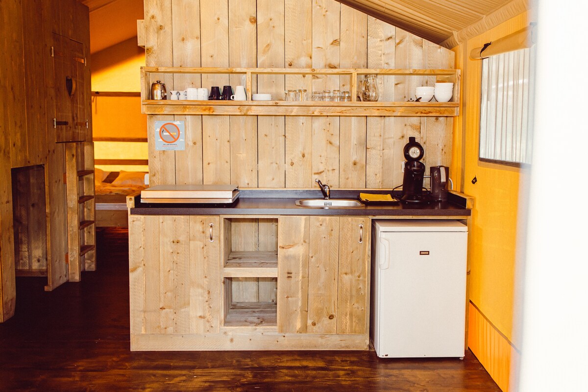 Deze unieke safaritent is van alle gemakken voorzien voor de perfecte glampingvakantie! De tent is voorzien van een gezellig veranda met luifel, een compleet ingerichte keuken met inventaris en twee slaapcabines.