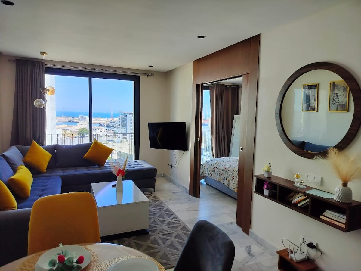 Enjoy a comfortable and stylish stay in the heart of Casablanca Finance City (CFC). This modern one-bed apartment offers beautiful open views, plenty of natural light, and a calm atmosphere above the city The apartment features a spacious bedroom with a comfortable bed and quality linens, a bright living area perfect for relaxing or working, and a fully equipped kitchen for short or extended stays. Large windows showcase panoramic city views, making mornings and evenings especially enjoyable