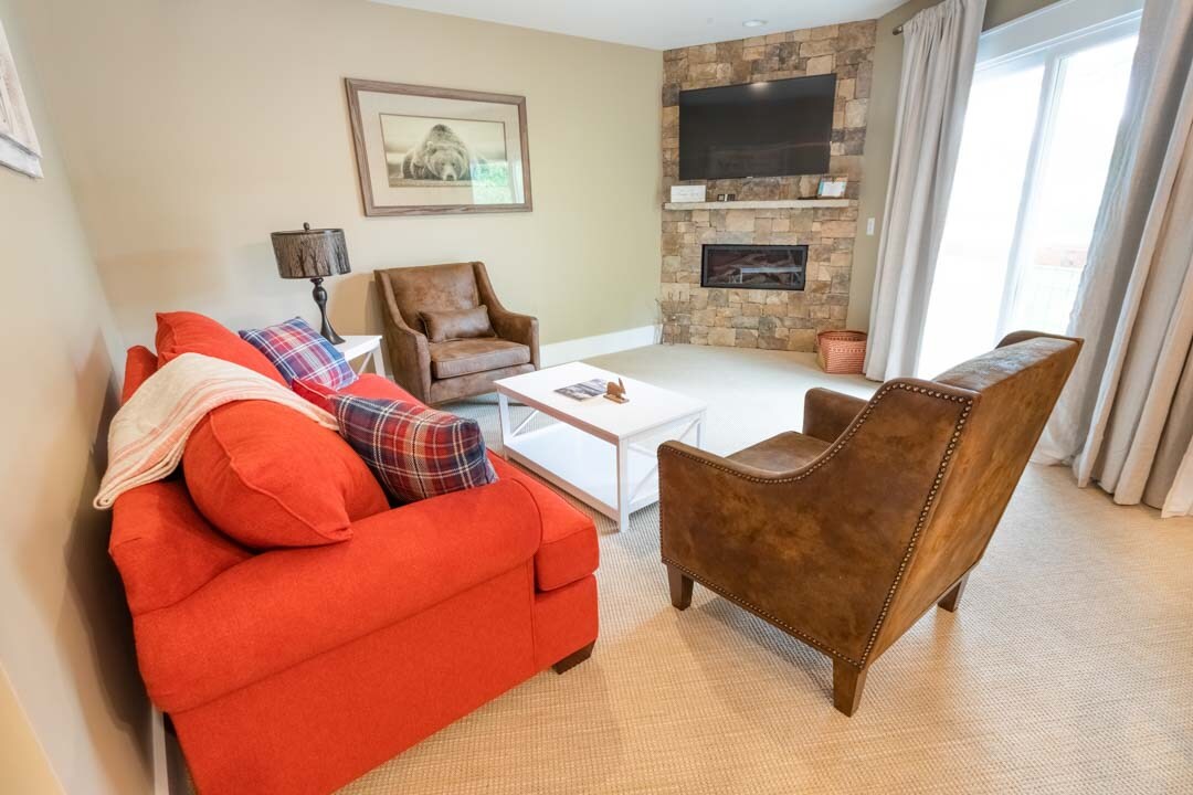 룸 1 오너스 스위트는 산악 럭셔리, 분위기, 짐을 풀고 정착할 수 있는 최고의 공간입니다! 이 스위트룸은 이탈리아 리넨이 있는 럭셔리 킹사이즈 침대가 있는 침실, 만찬을 준비하는 데 필요한 모든 것이 갖춰진 간이 주방, 가스 벽난로와 평면 TV가 있는 거실, 럭셔리 세면용품, 로브, 고원의 최고의 샤워 시설이 있는 스파 욕실을 갖추고 있습니다! 또한 전용 현관 공간과 문 바로 바깥에 있는 화덕을 즐겨보세요! 전자기기에서 벗어나 중요한 것과 다시 연결해 보세요!