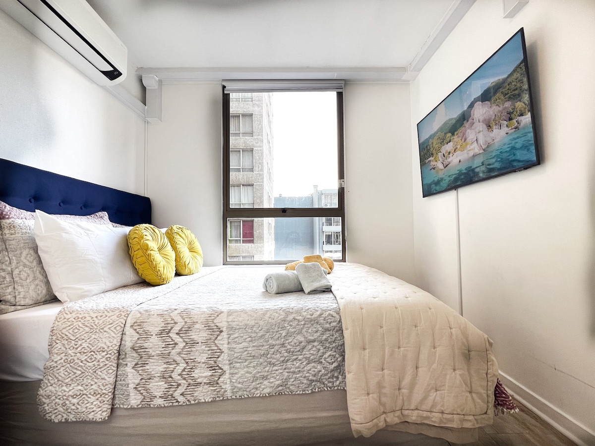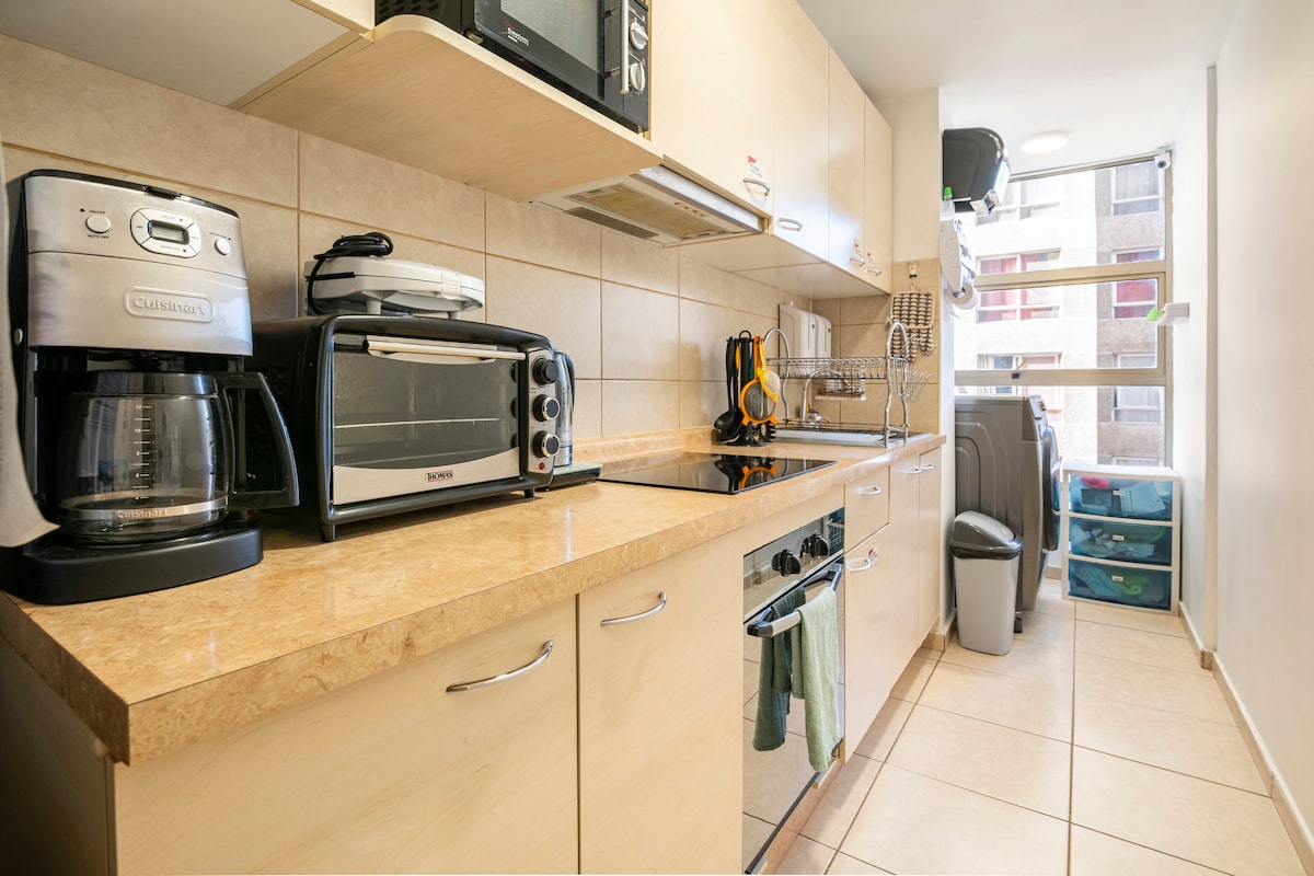 산티아고 시내 한복판에 위치한 넓고 밝고 매우 편안한 아파트이며, 메트로 토에스카, 모비스타 아레나, 판타실란디아, 파르케 오히긴스까지 도보로 이동할 수 있습니다. 콘서트, 출장 또는 관광에 이상적입니다. 자율 체크인, 에어컨, 주방 시설 및 와이파이가 있습니다. 써모패널로 단열됩니다. 산맥 전망이 탁 트인 객실, 침대 시트, 수건, 세면도구, 세탁기, 스마트 TV, 24시간 컨시어지. 도시로 쉽게 이동하고 조용한 동네로 돌아와 쉬실 수 있습니다.