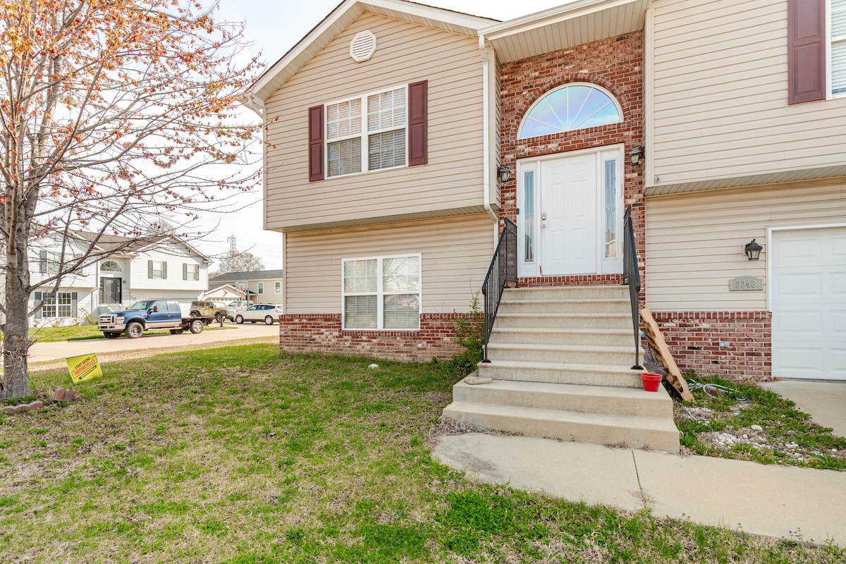 힐탑 랜치 홈에 오신 것을 환영합니다! 온 가족 또는 여러 커플을 위한 편안한 휴양지를 찾을 수 있습니다. 1층에는 자쿠지 욕조를 갖춘 전용 욕실이 있는 마스터 침실, 완비된 주방, 가스 벽난로, 2대의 차량을 주차할 수 있는 차고 등 1800평방피트의 공간이 있습니다. 지하 1층에는 네 번째 침실, 욕조, TV 공간이 있습니다. 식사 공간, 숯 그릴, 풀사이즈 욕조와 인접한 파티오는 일행 전체가 즐기기에 완벽합니다.