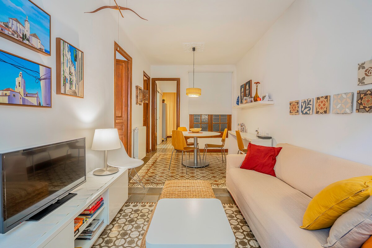 Welcome to our modernist apartment located in Barcelona's vibrant Mercat de Sant Antoni. Nestled in a beautifully refurbished historic building, we have preserved the allure of Modernist architecture: high ceilings, original tile floors. Very Quietly situated at the building's rear, it features a small private terrace. Modern amenities: equipped kitchen, central AC, high-speed internet, smart TV. Only 10-minute walk to the historical center. Direct metro access right outside.